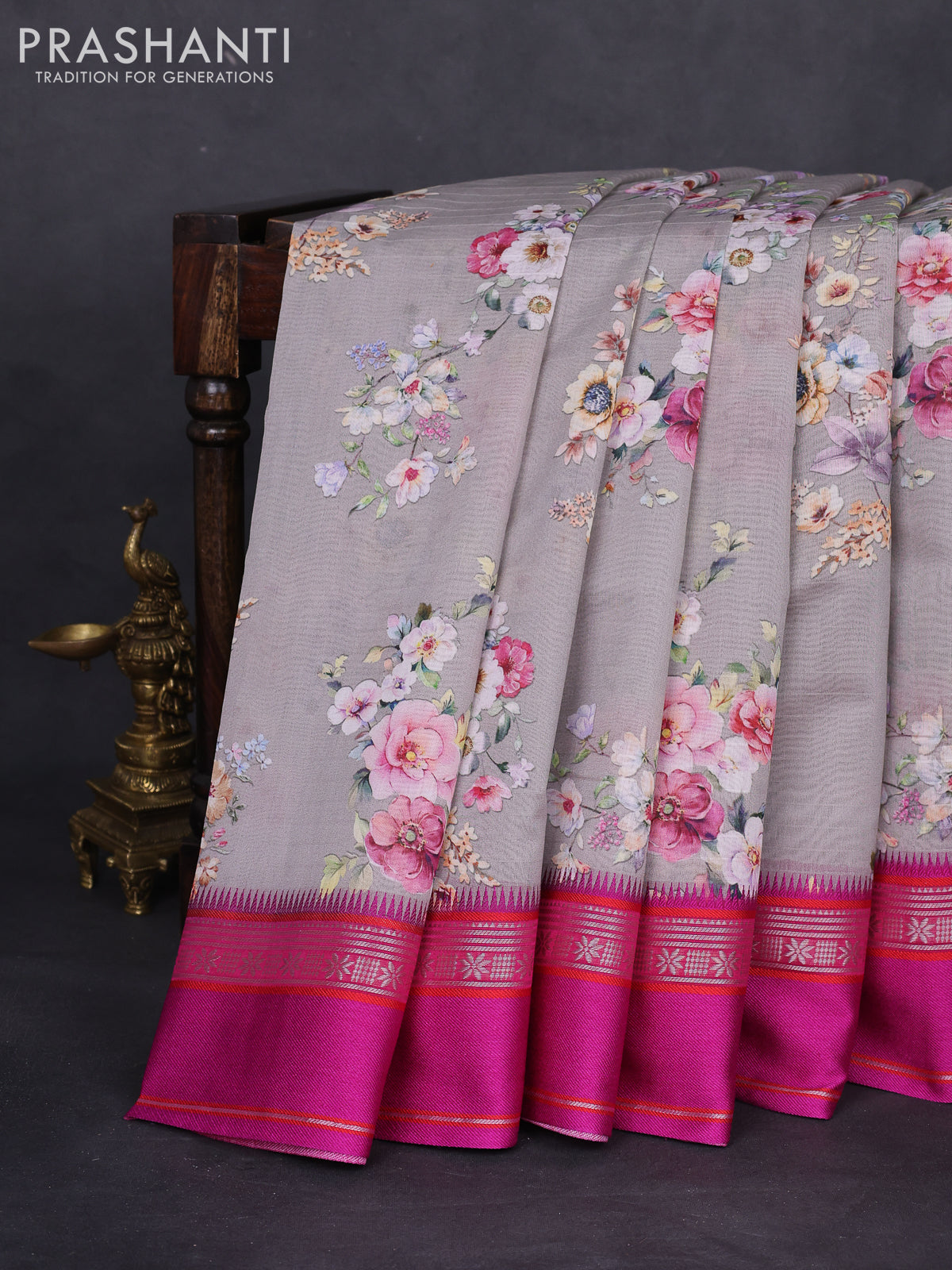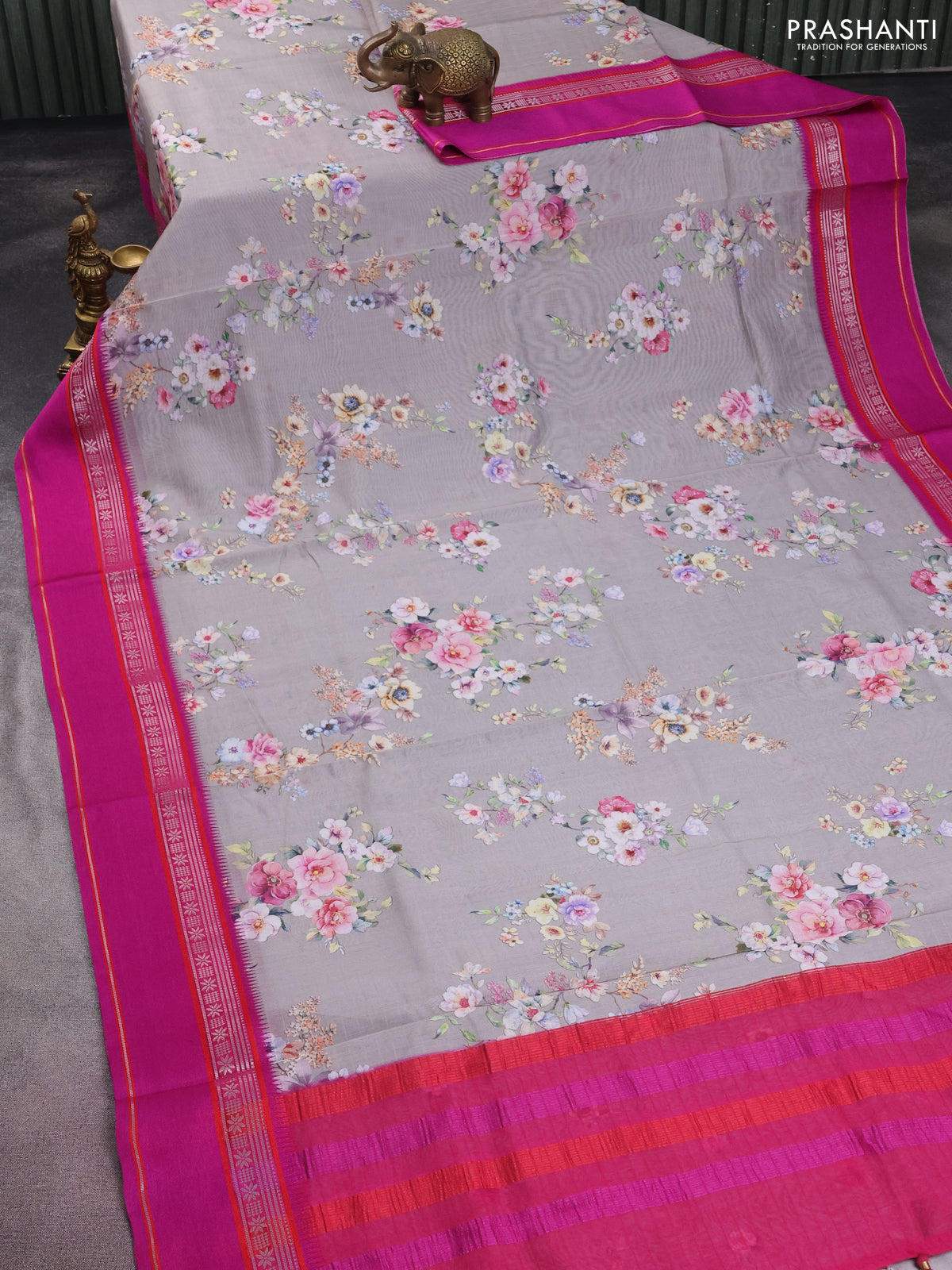 Maheshwari silk cotton saree grey and pink with allover floral digital prints and rettapet thread woven border