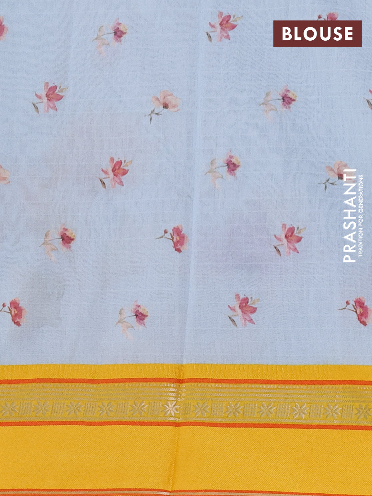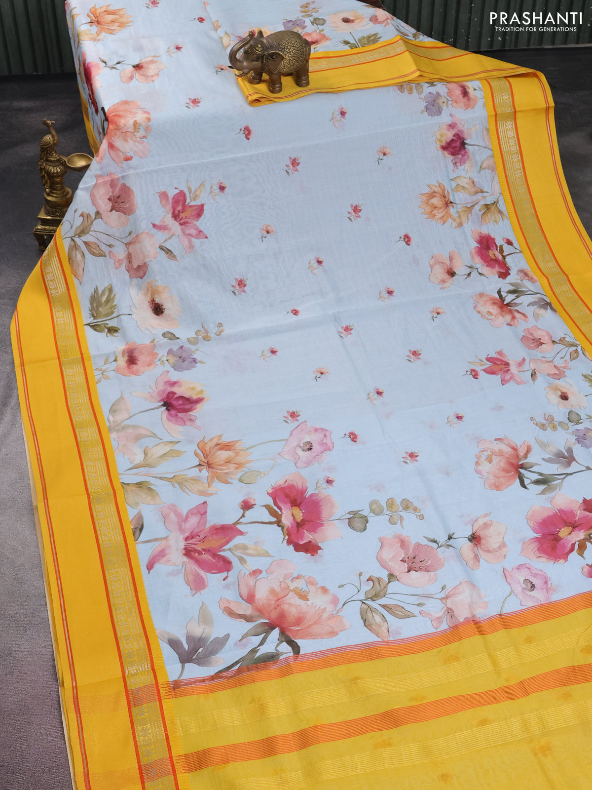 Maheshwari silk cotton saree light blue and yellow with allover floral digital butta prints and rettapet thread woven border