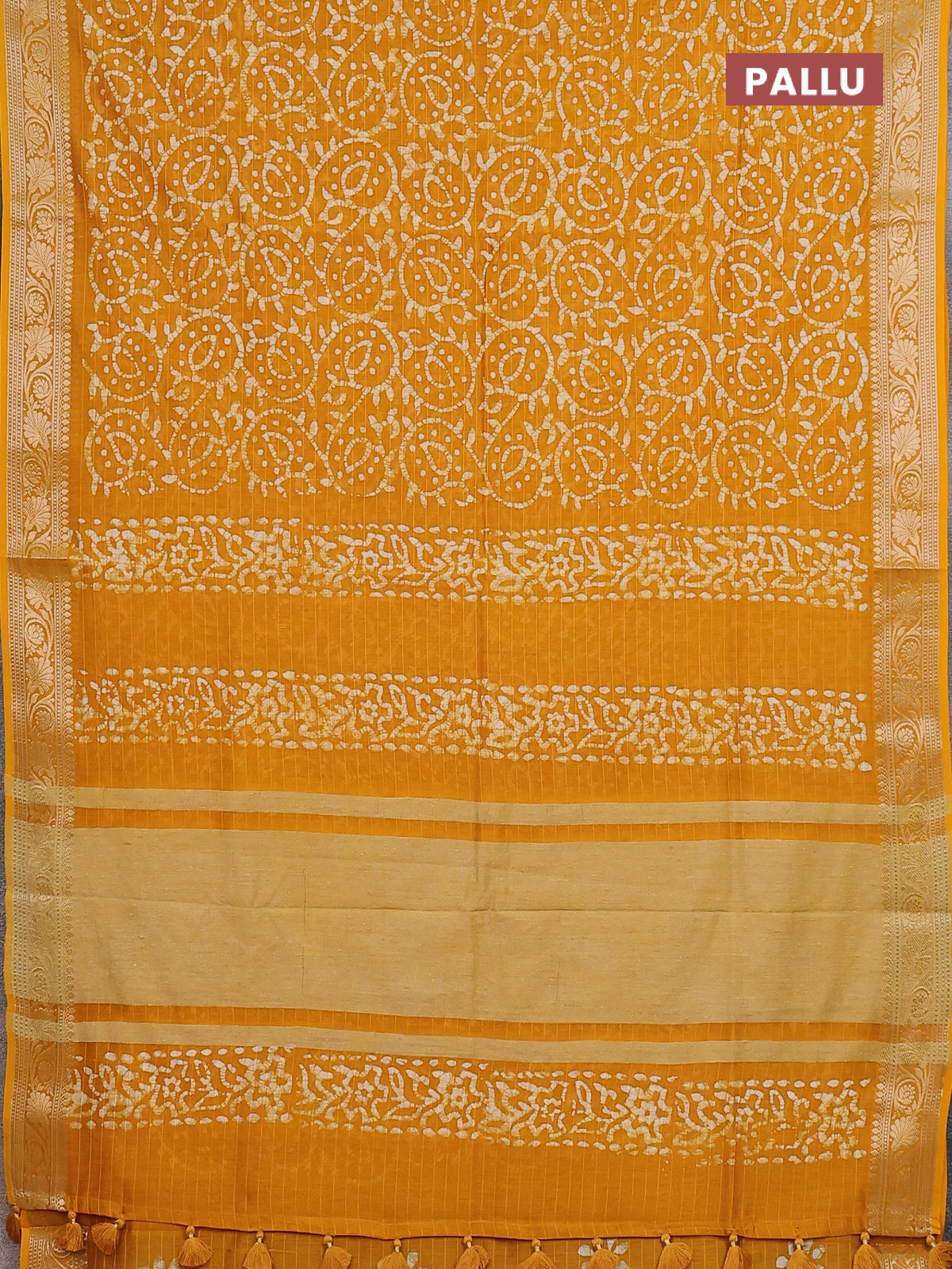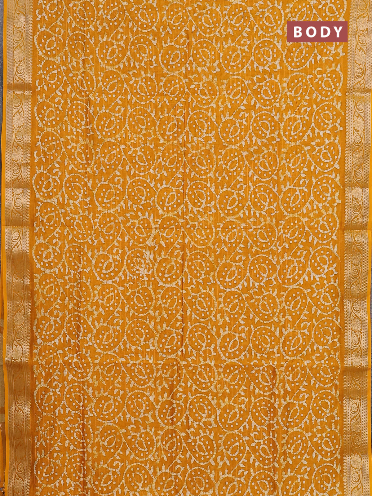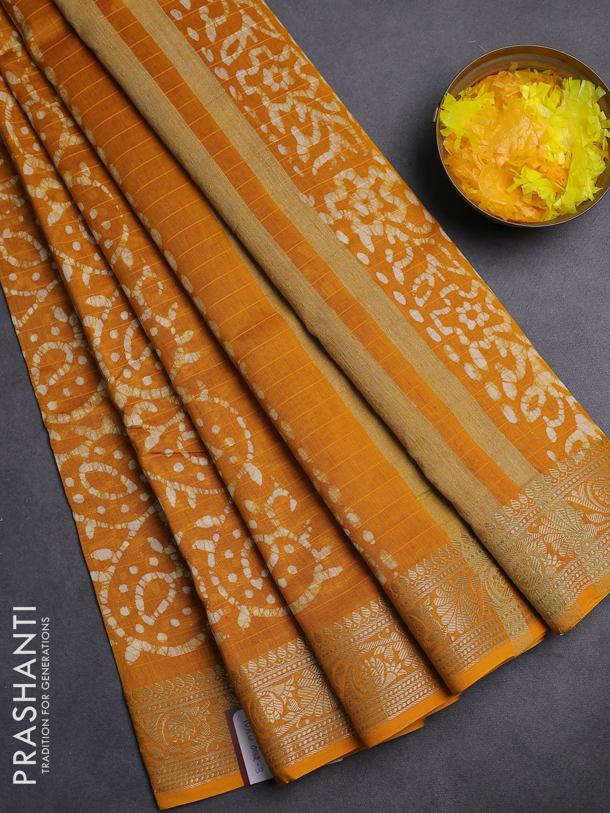 Maheshwari silk cotton saree mustard yellow with allover batik prints and zari woven border