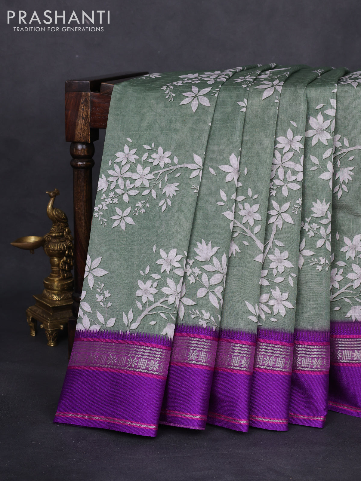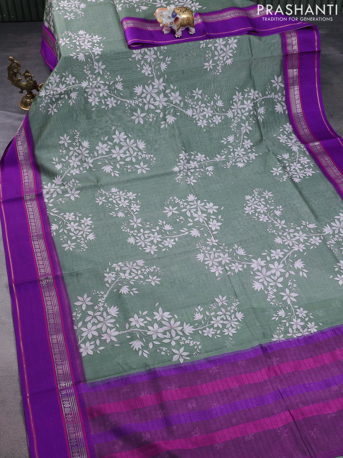 Maheshwari silk cotton saree pastel green and purple with allover digital prints and rettapet thread woven border