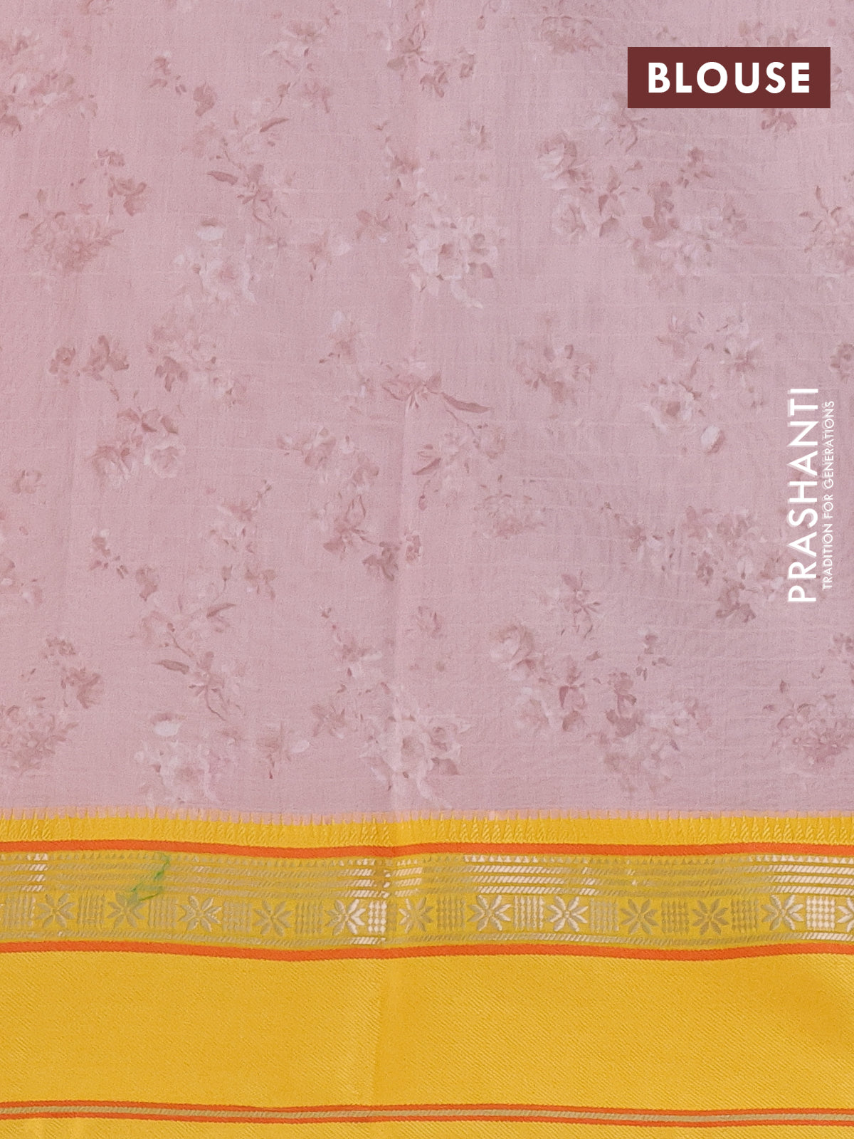 Maheshwari silk cotton saree pastel peach and yellow with allover floral digital prints and rettapet thread woven border