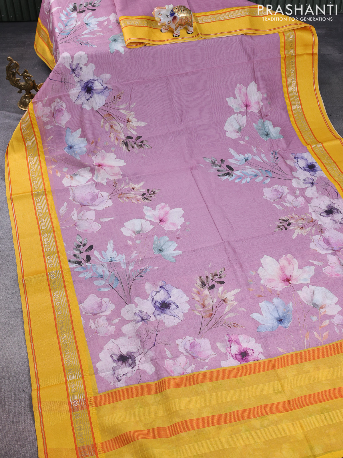 Maheshwari silk cotton saree pastel pink and yellow with allover floral digital prints and rettapet thread woven border