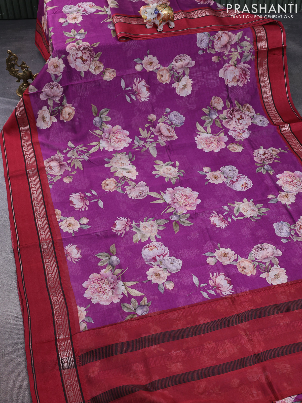 Maheshwari silk cotton saree purple and maroon with allover floral digital prints and rettapet thread woven border