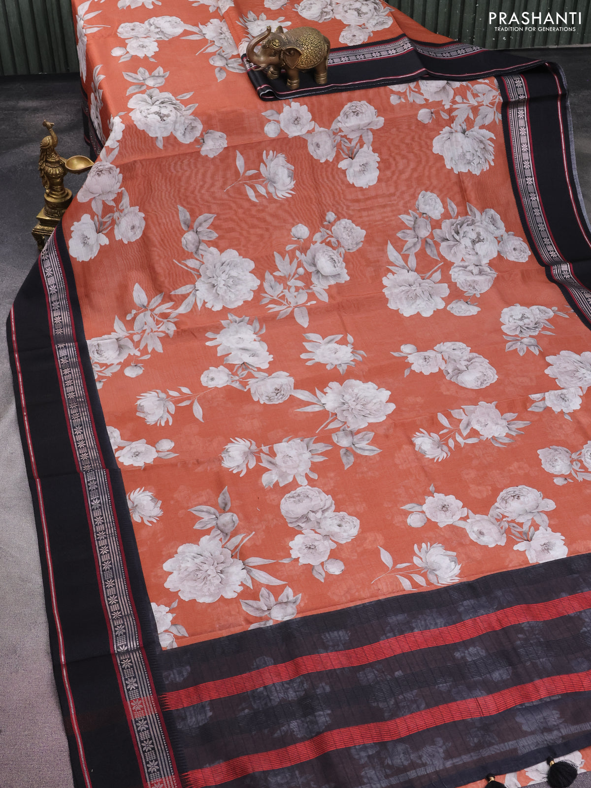 Maheshwari silk cotton saree rust shade and black with allover floral digital prints and rettapet thread woven border