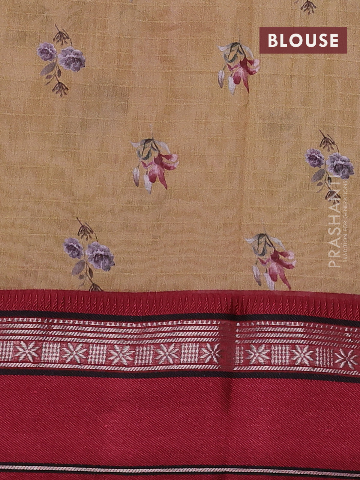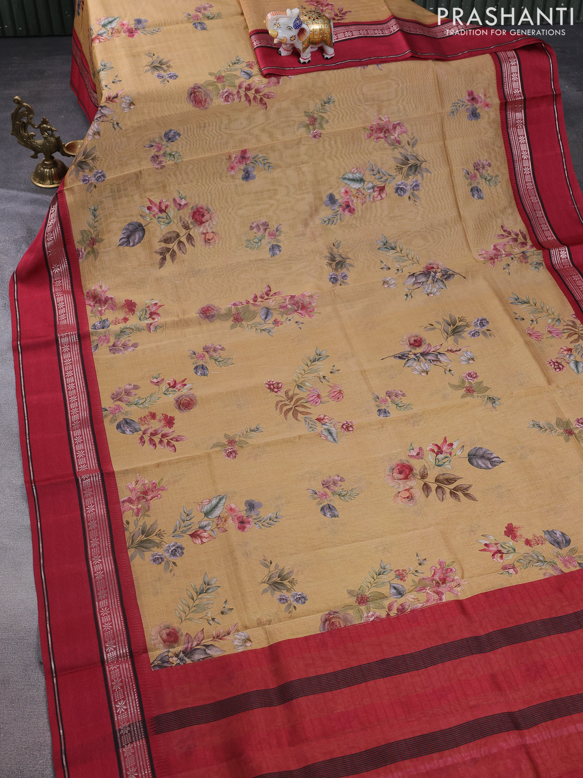 Maheshwari silk cotton saree sandal and maroon with allover floral digital prints and rettapet thread woven border