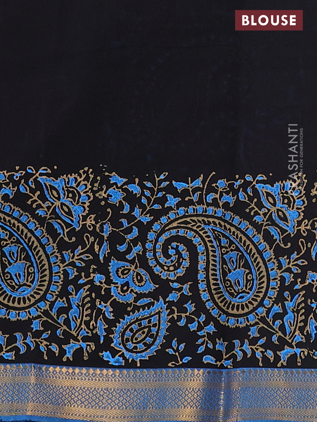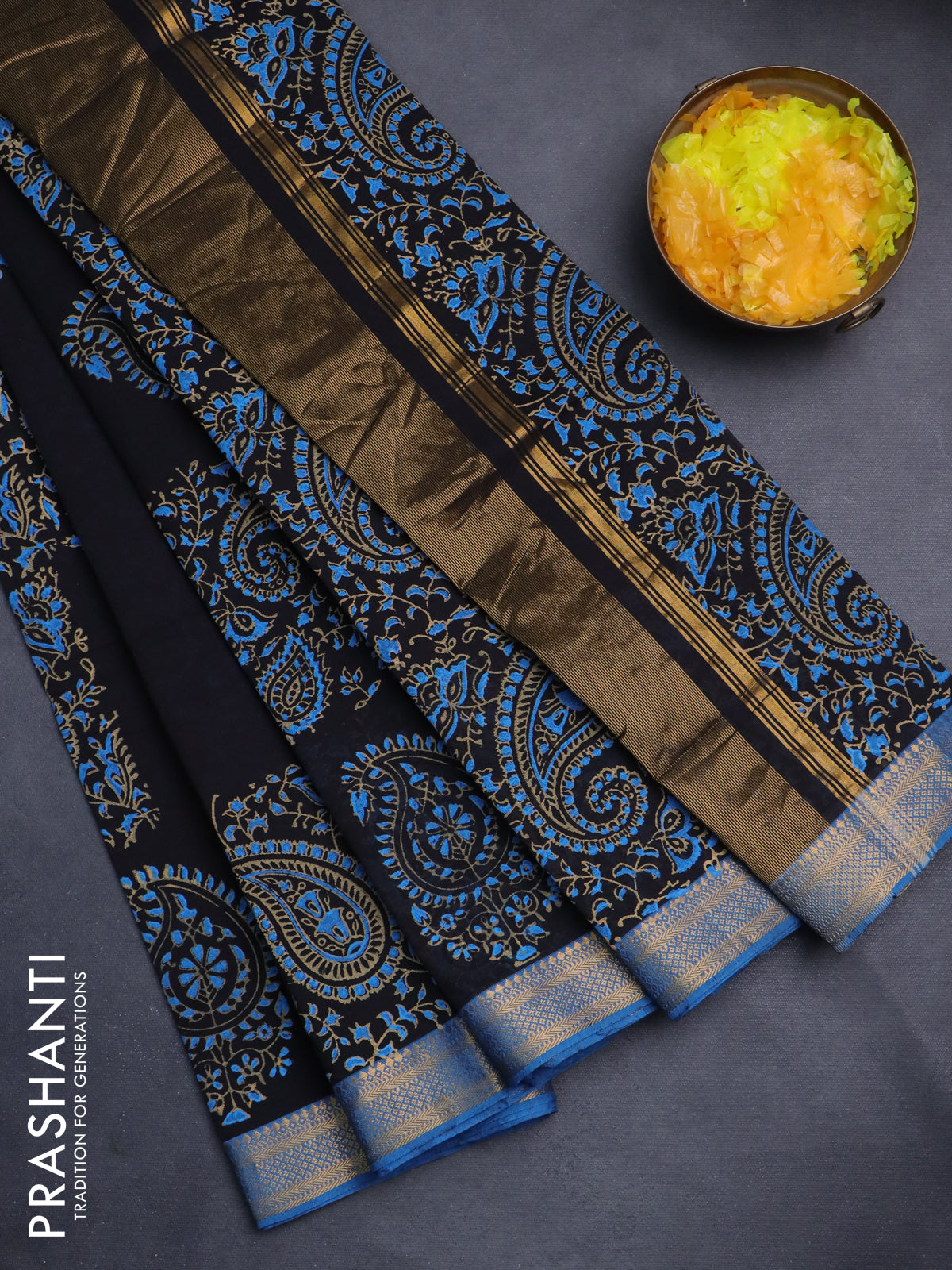 Mangalgiri cotton block printed saree black and cs blue with allover prints and zari woven border