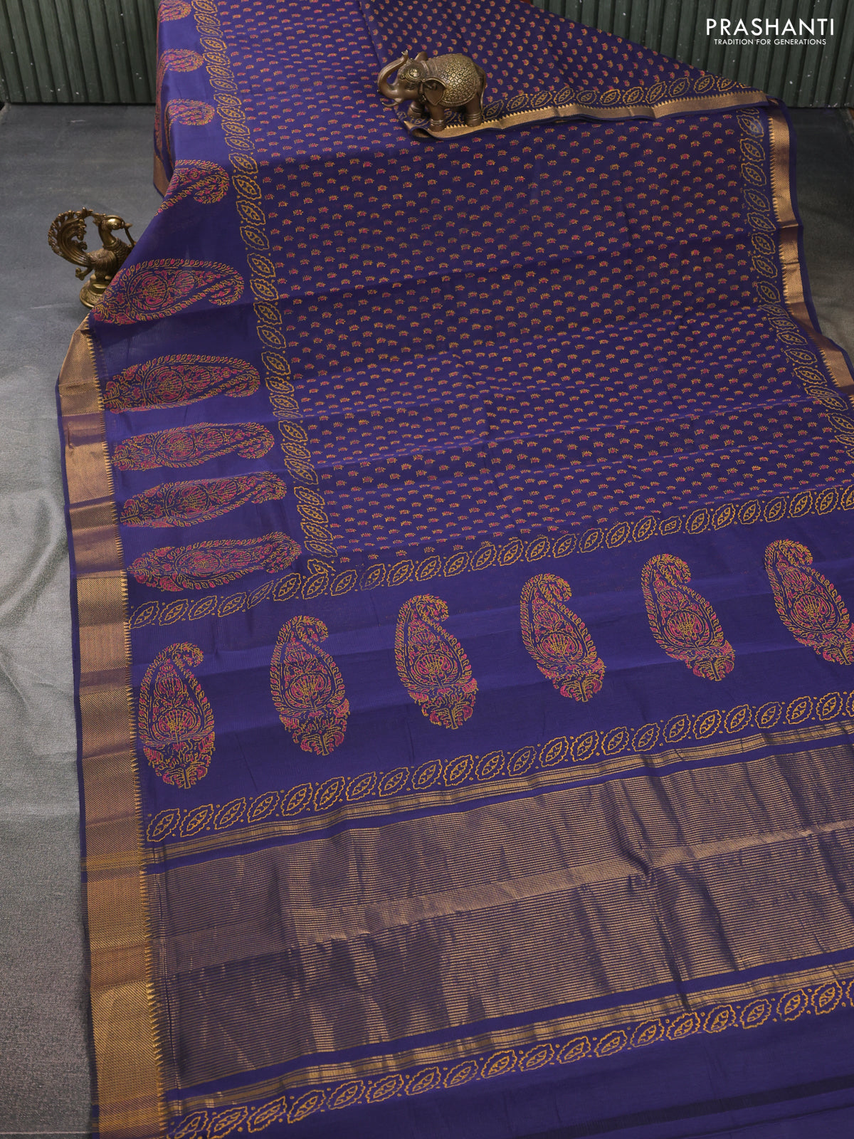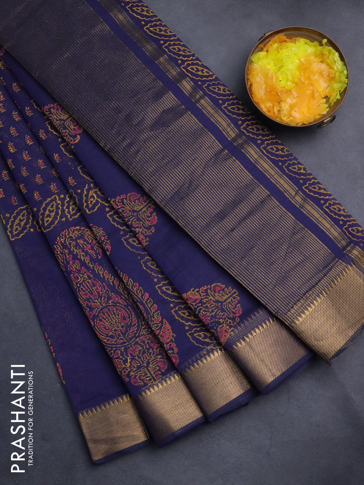 Mangalgiri cotton block printed saree dark blue with allover butta prints and zari woven border