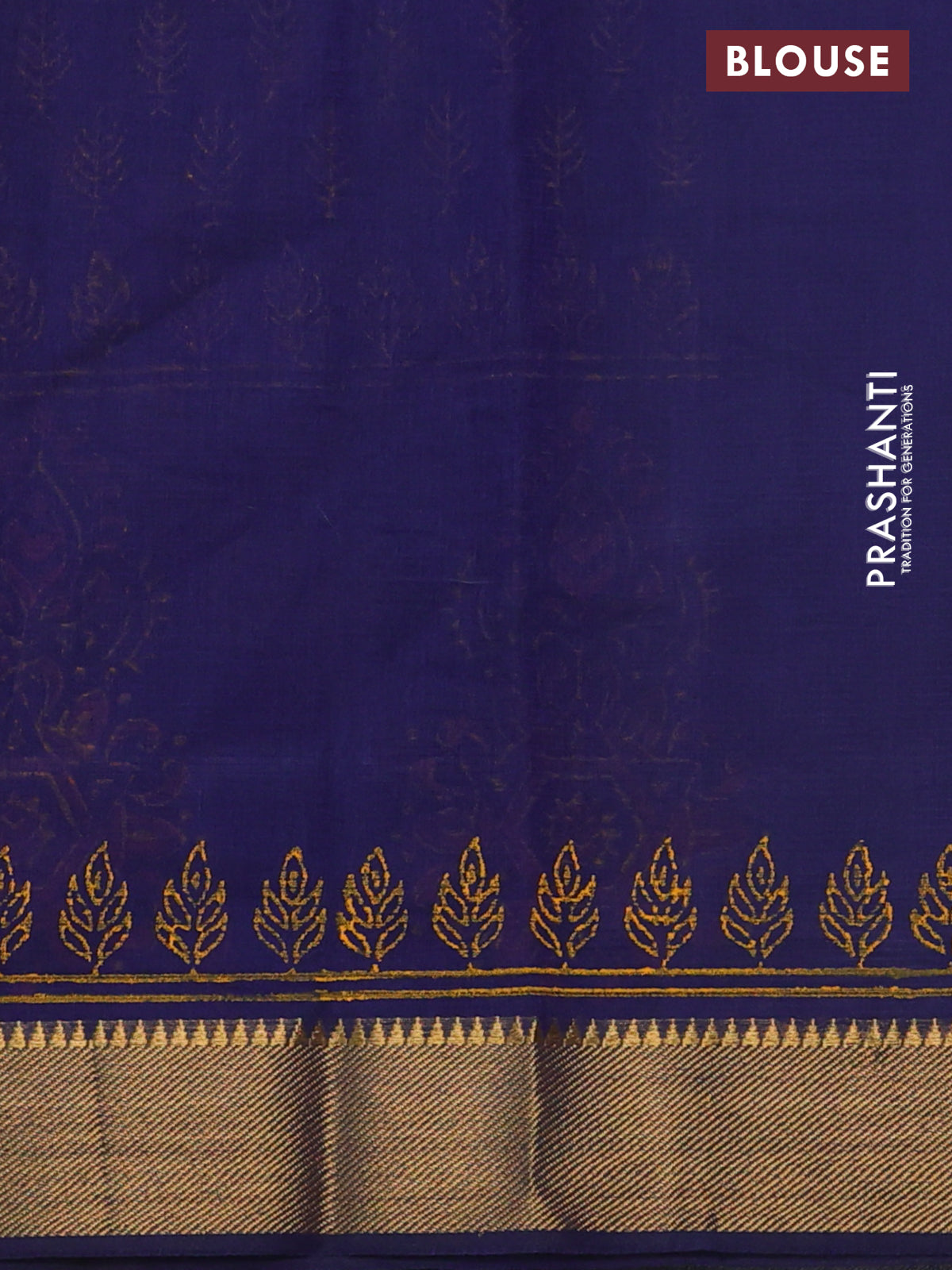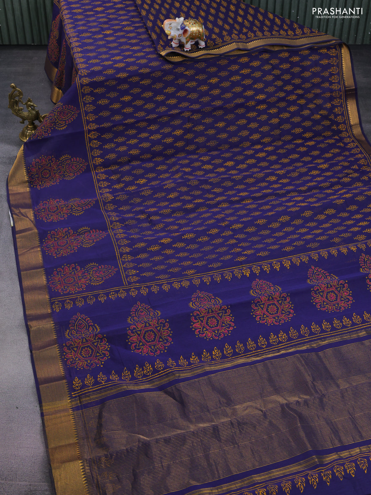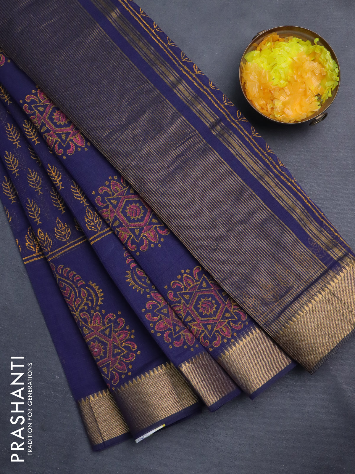 Mangalgiri cotton block printed saree dark blue with allover butta prints and zari woven border