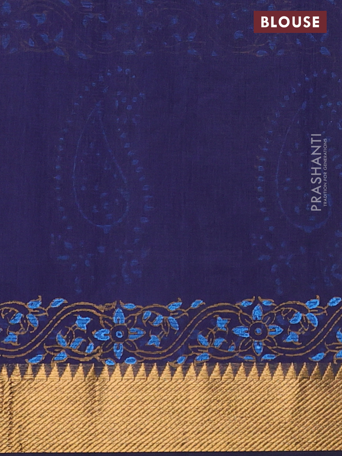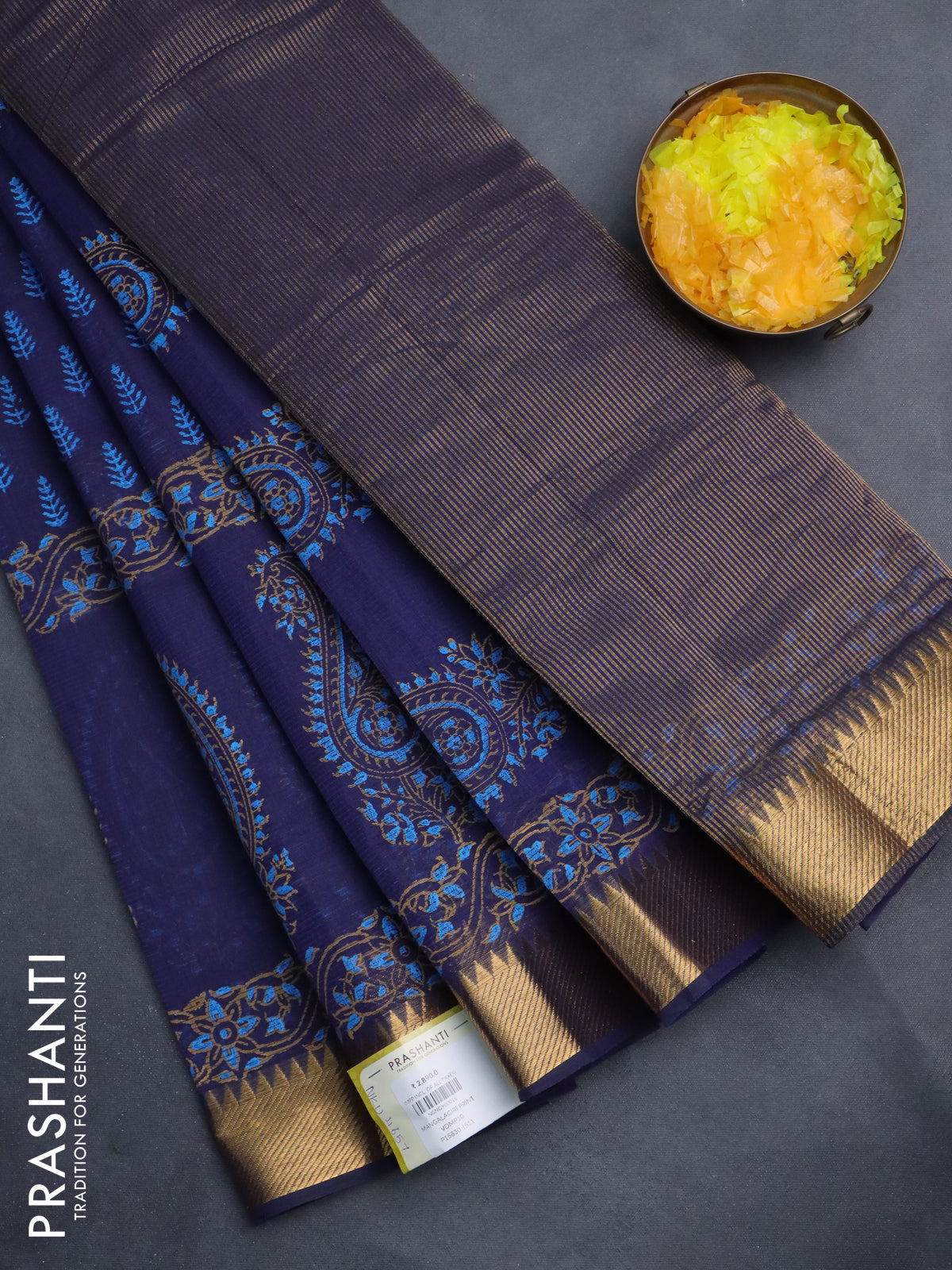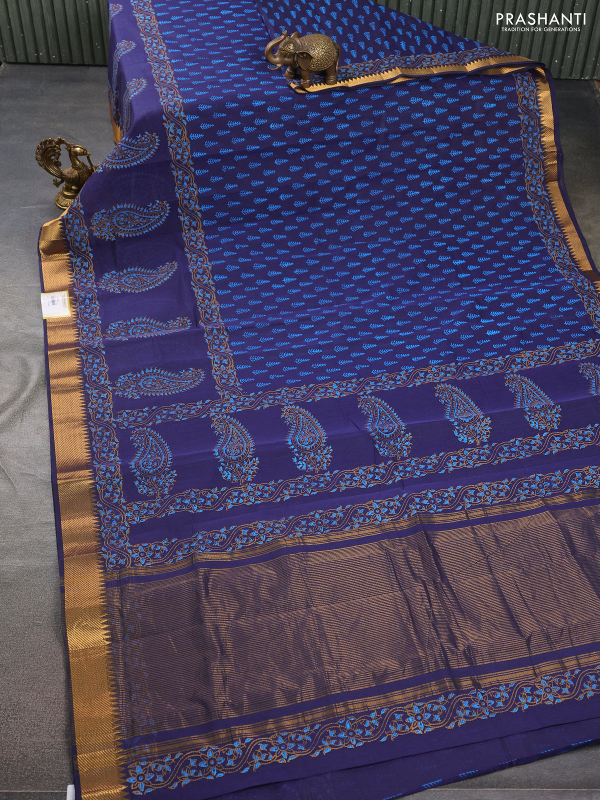 Mangalgiri cotton block printed saree dark blue with allover butta prints and zari woven border