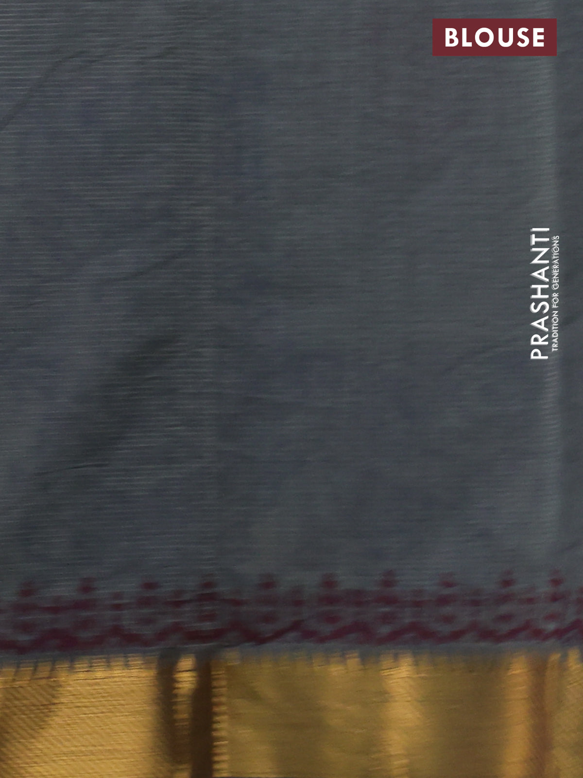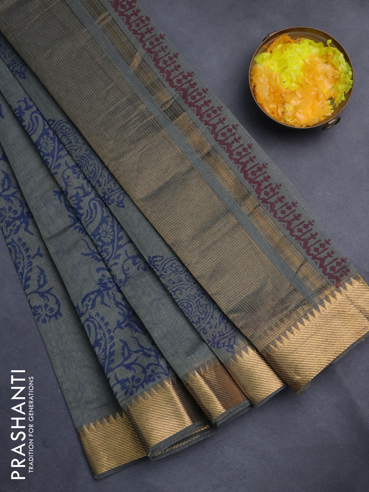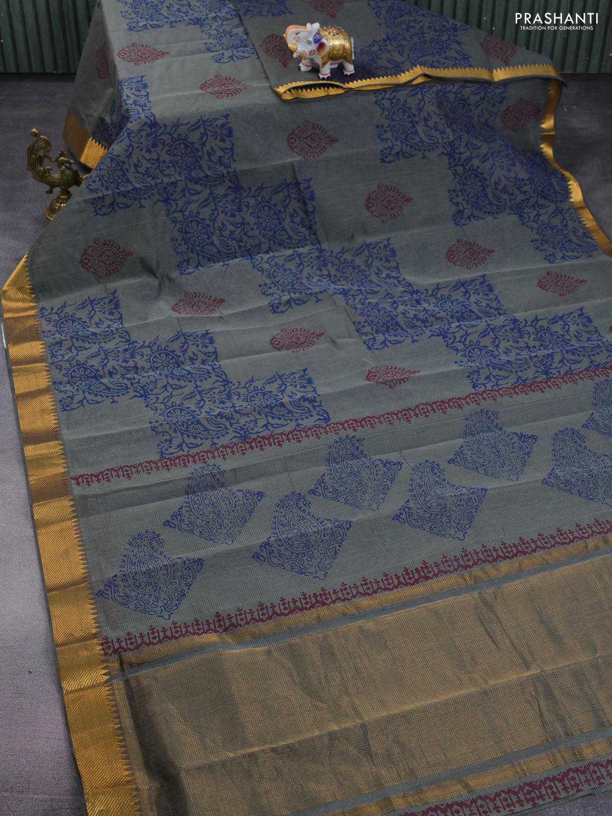 Mangalgiri cotton block printed saree grey with butta prints and zari woven border