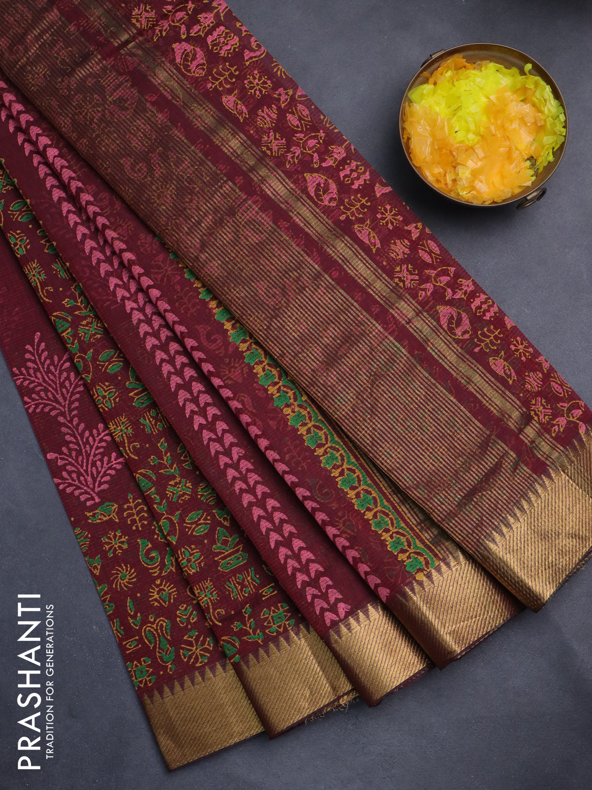 Mangalgiri cotton block printed saree maroon with allover prints and zari woven border