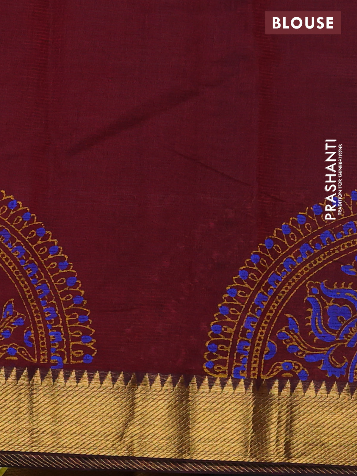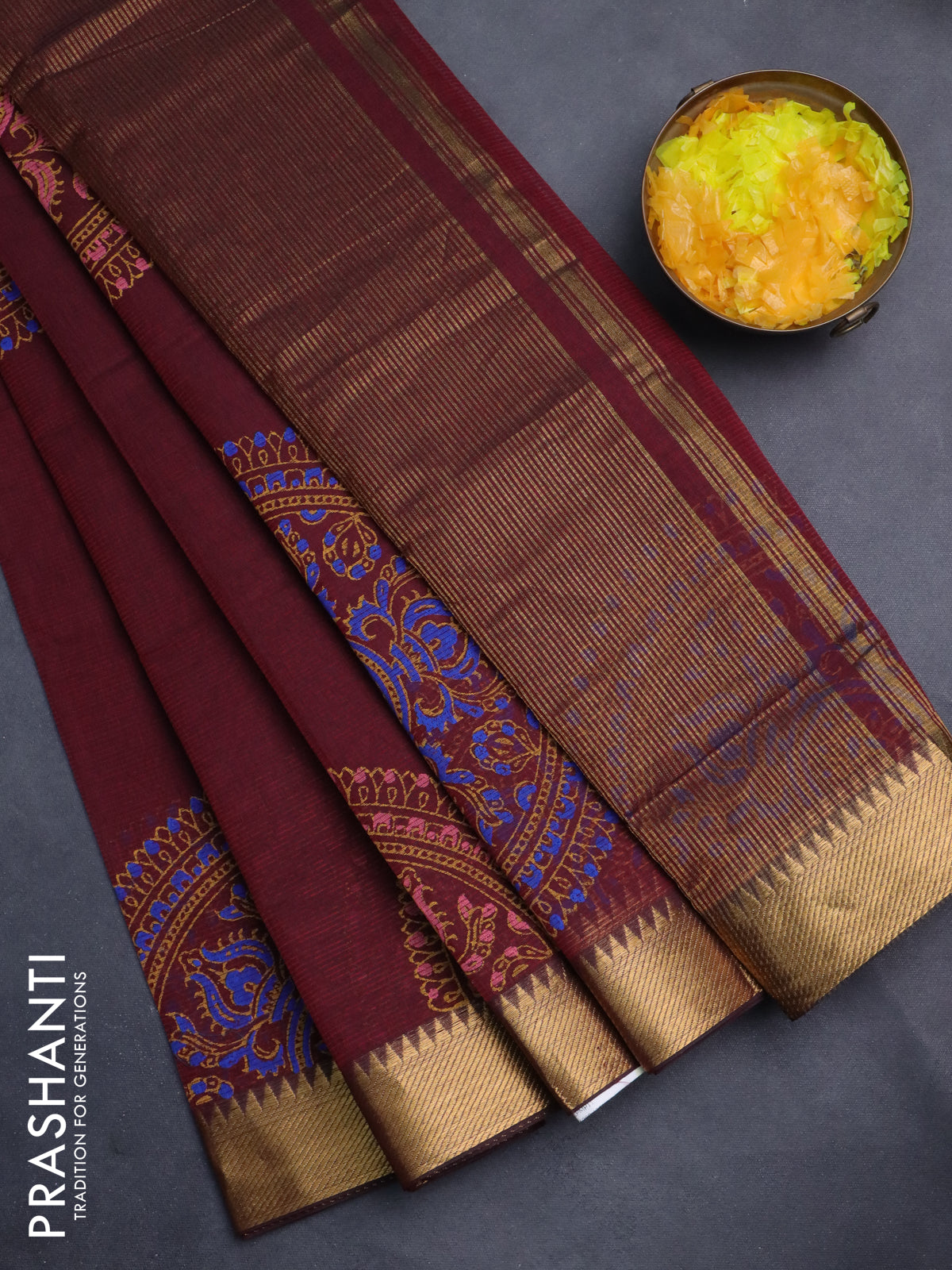 Mangalgiri cotton block printed saree maroon with butta prints and zari woven border