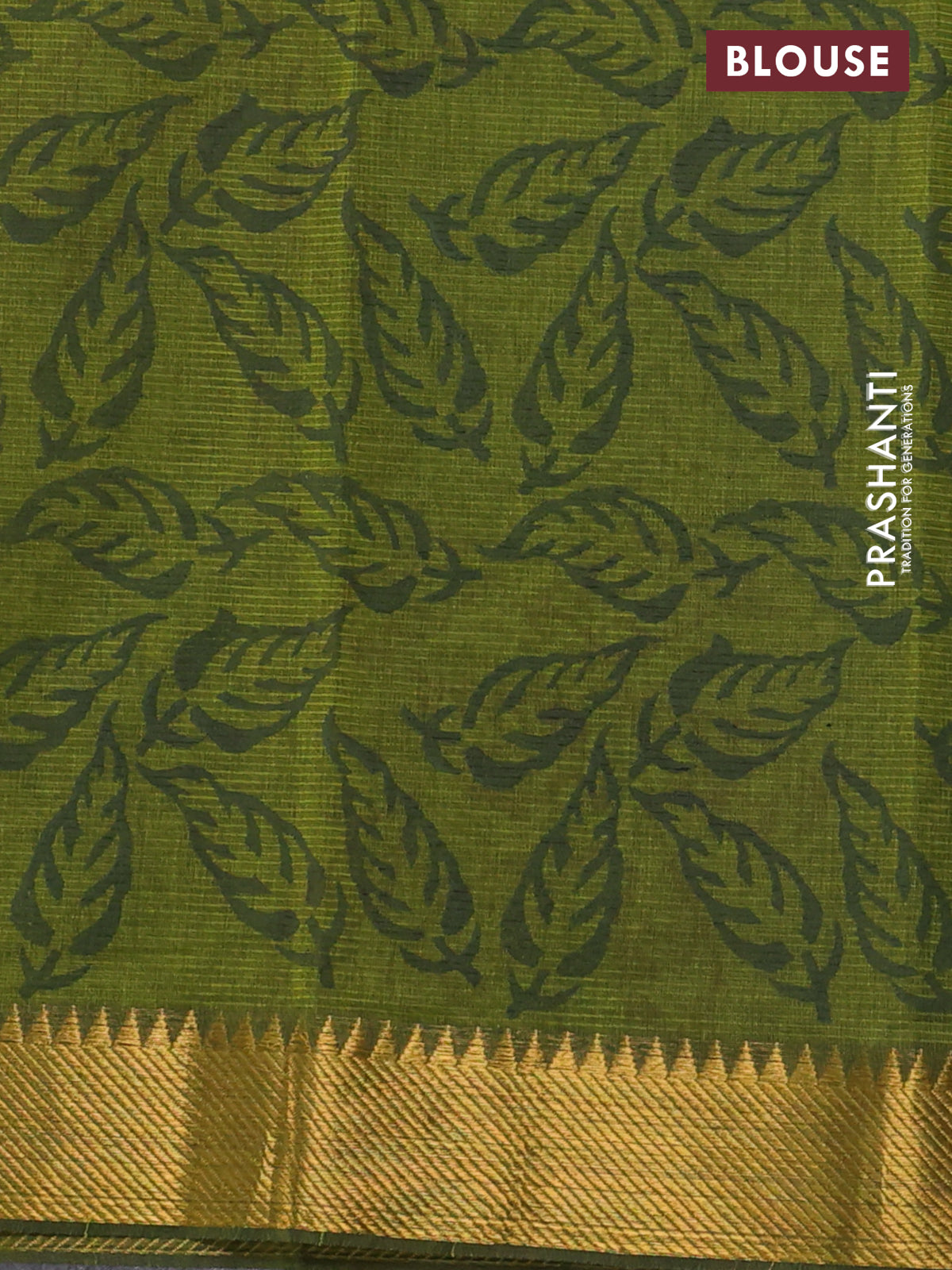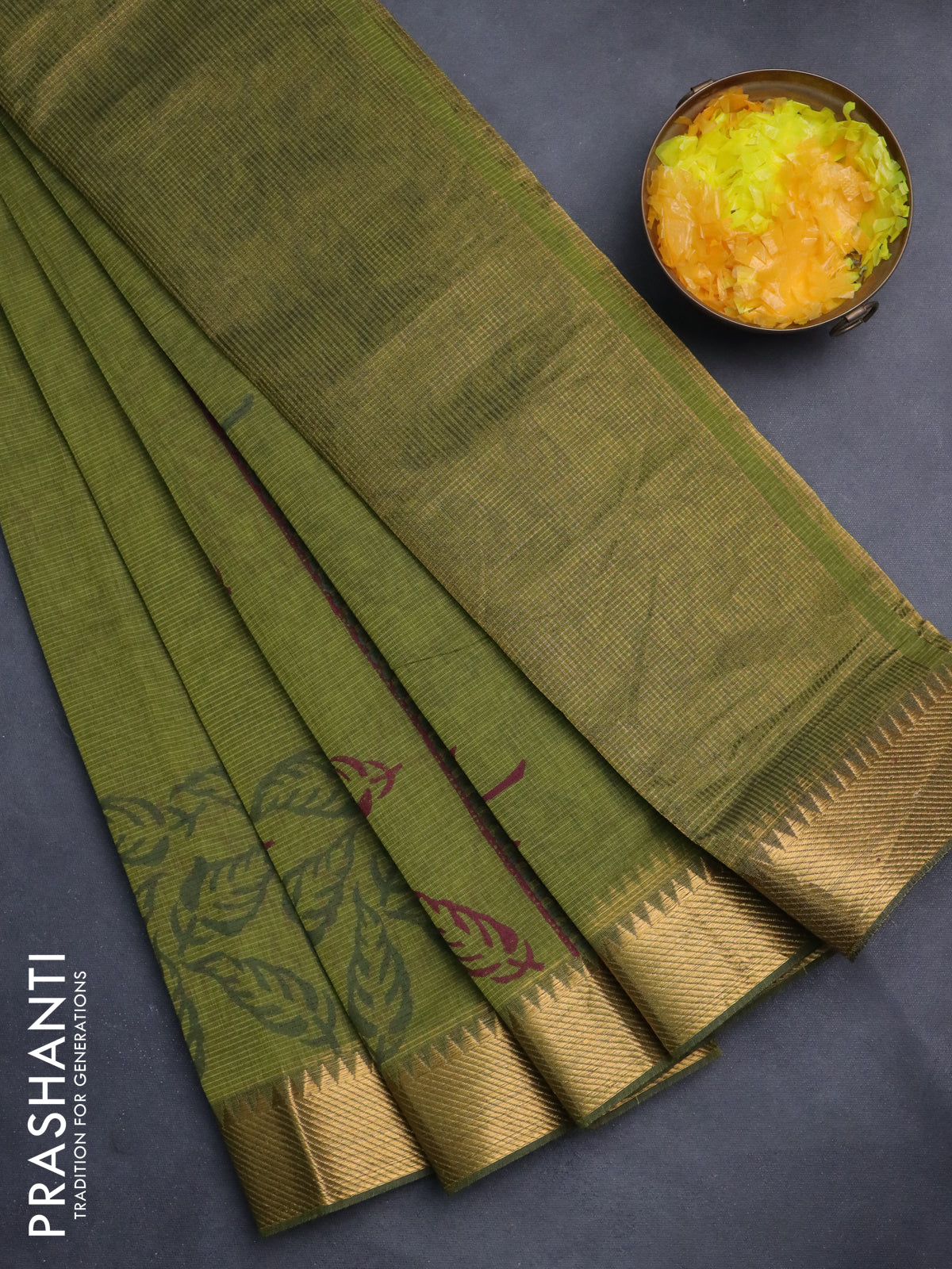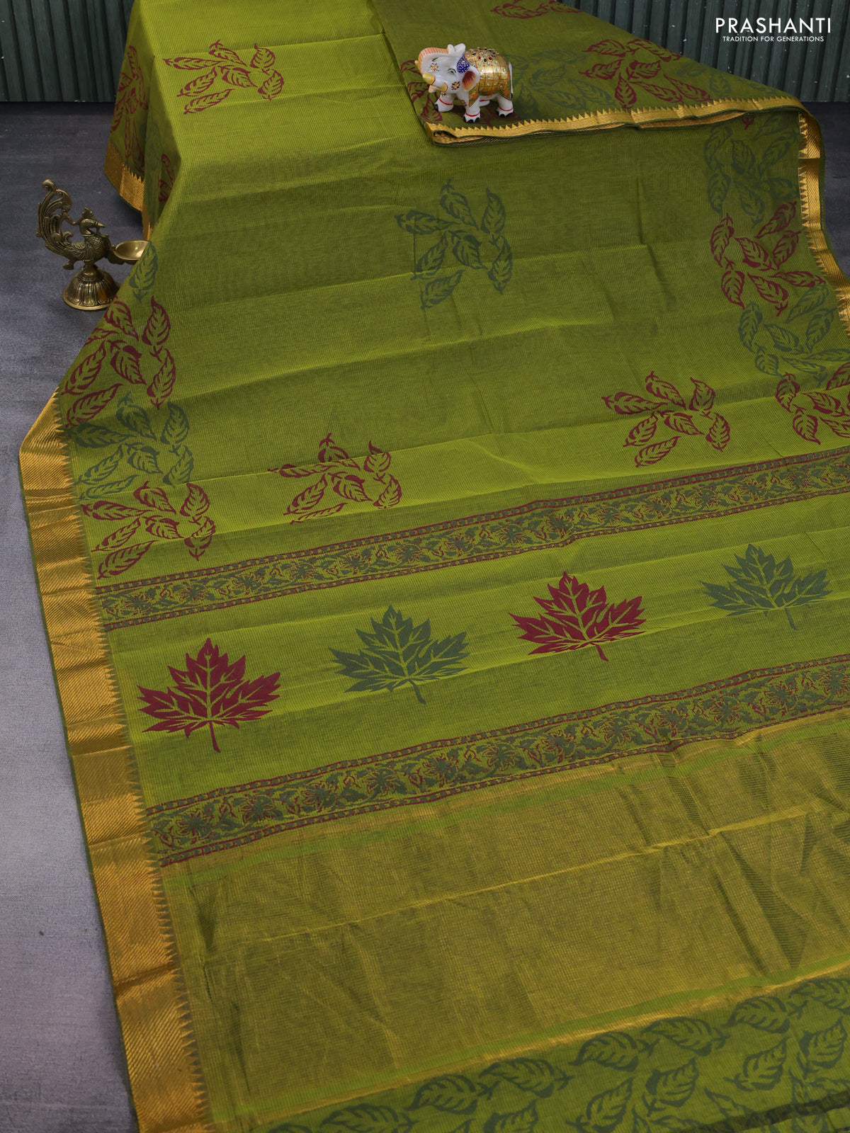 Mangalgiri cotton block printed saree mehendigreen with leaf butta prints and zari woven border