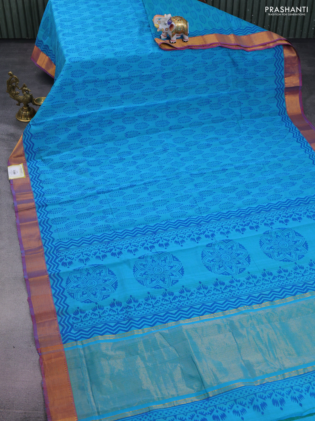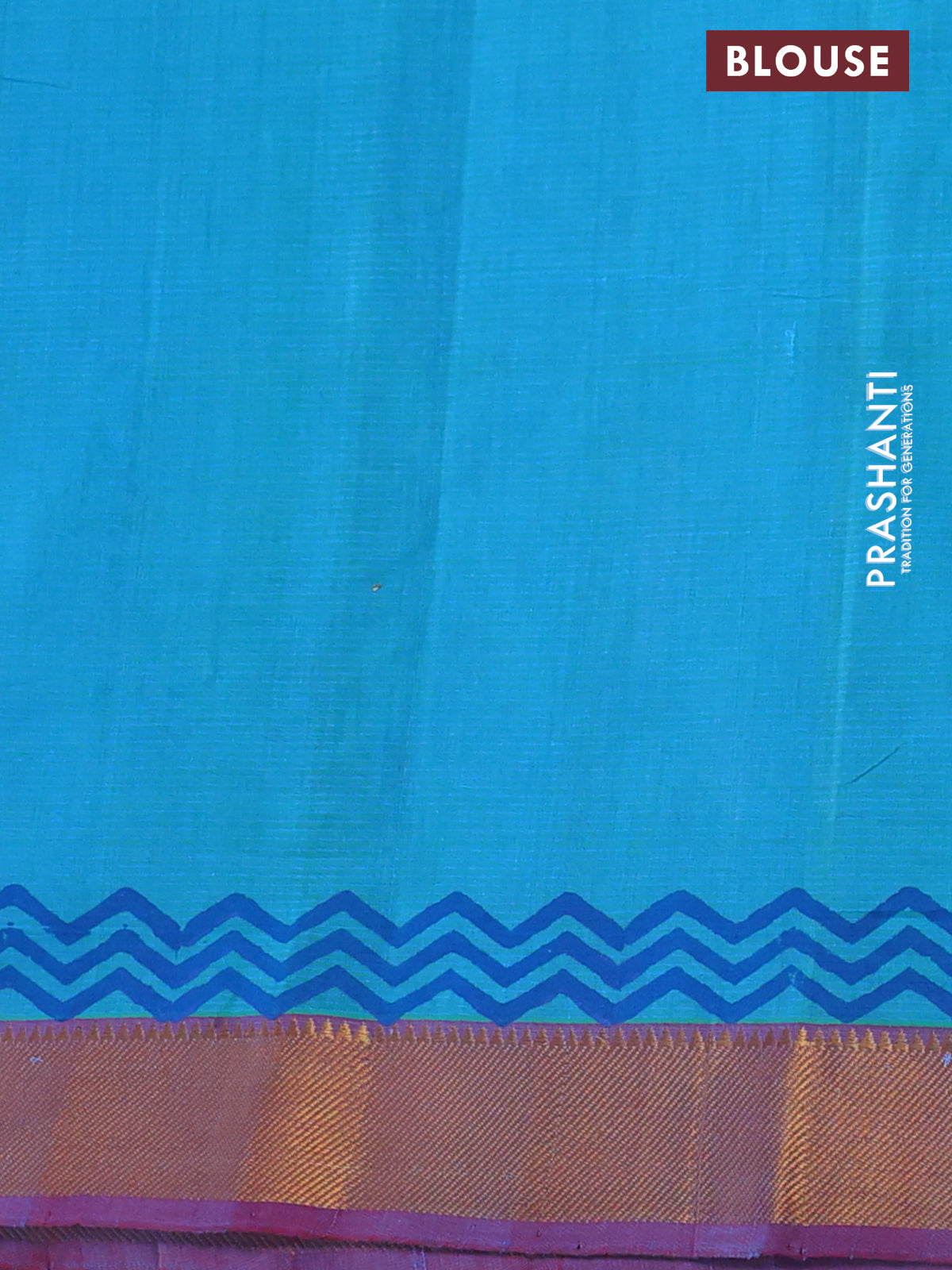 Mangalgiri cotton block printed saree teal blue and maroon with allover butta prints and zari woven border