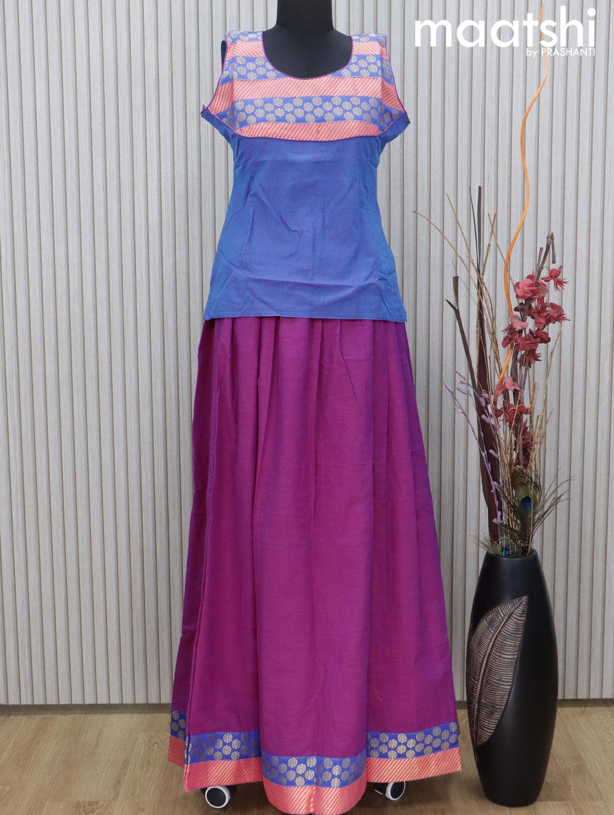 Mangalgiri cotton kids lehenga cs blue and magenta pink with patch work neck pattern and zari woven border Sleeve attached