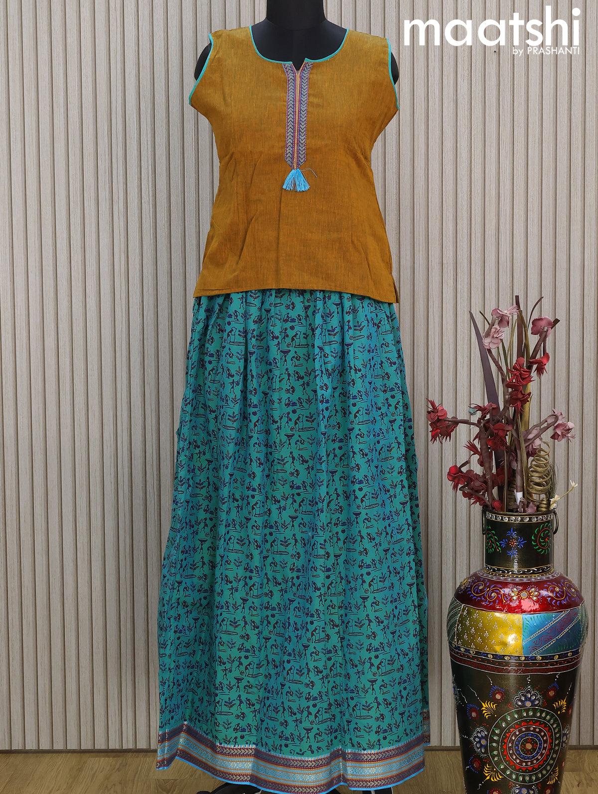 Mangalgiri cotton kids lehenga dark mustard and teal bluish green with patch work neck pattern and warli prints & woven border Sleeve attached
