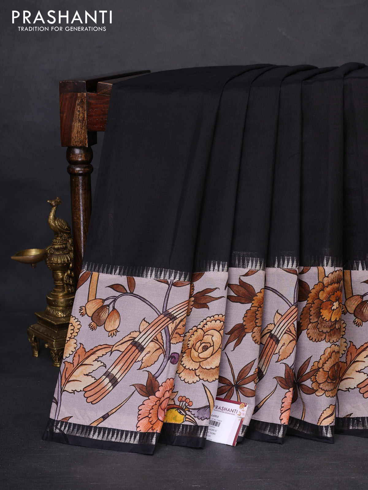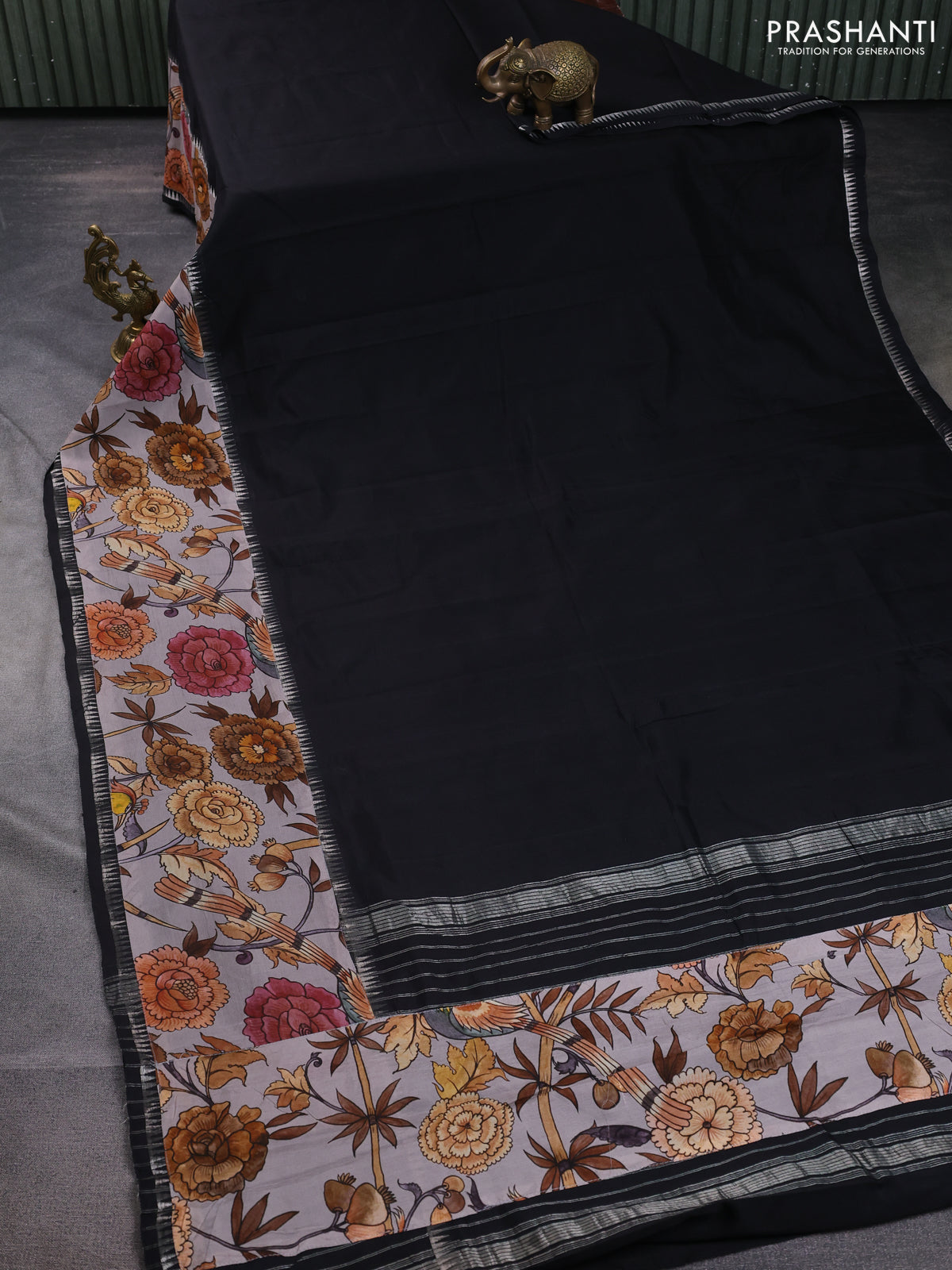 Mangalgiri silk cotton saree black and psatel grey with plain body and temple design kalamkari printed applique border