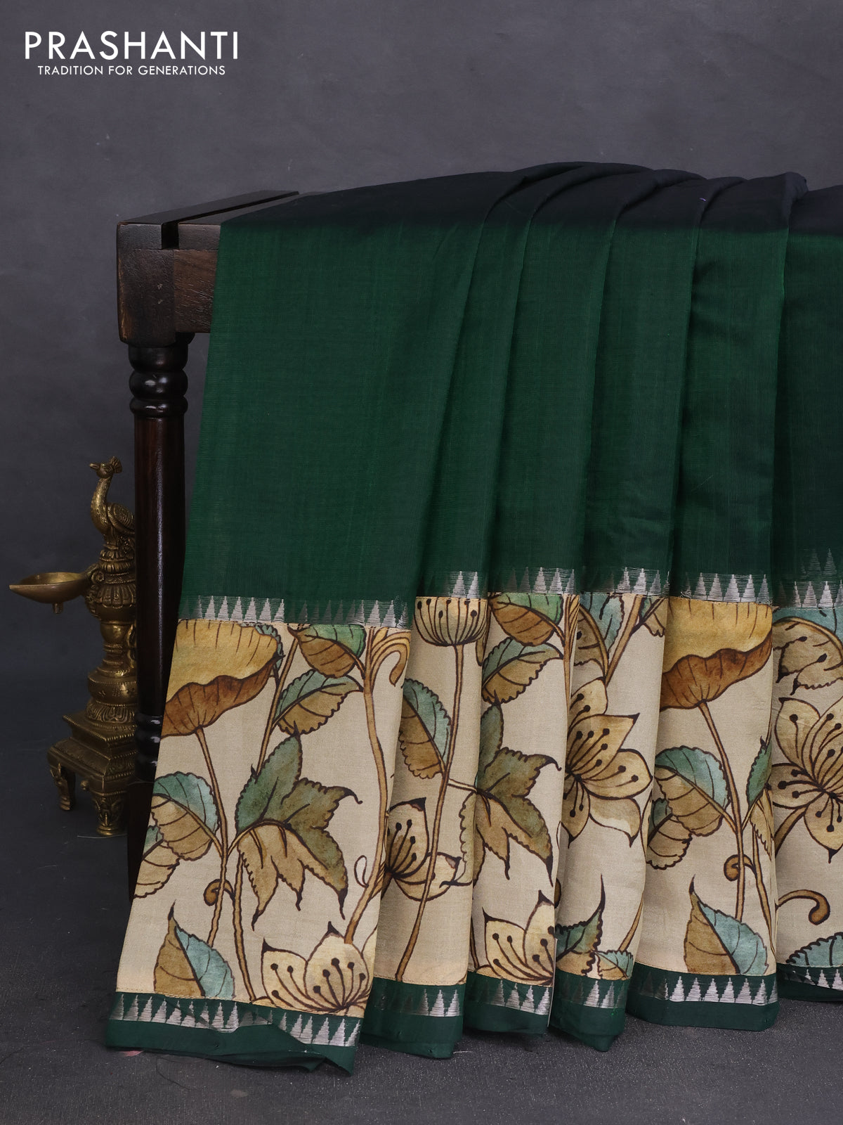Mangalgiri silk cotton saree bottle green and cream with plain body and long kalamkari printed applique border