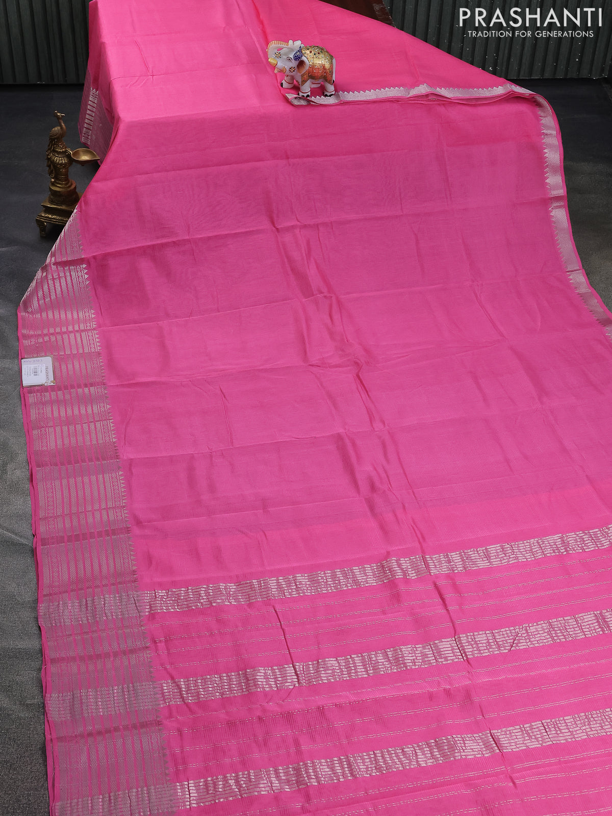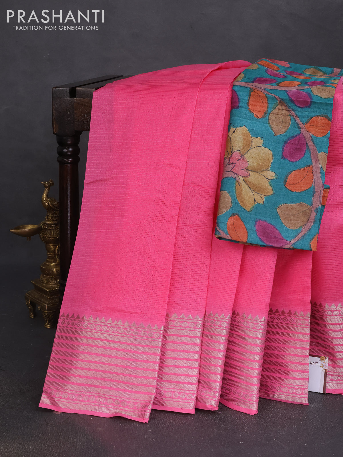 Mangalgiri silk cotton saree candy pink and teal green with plain body and silver zari woven border