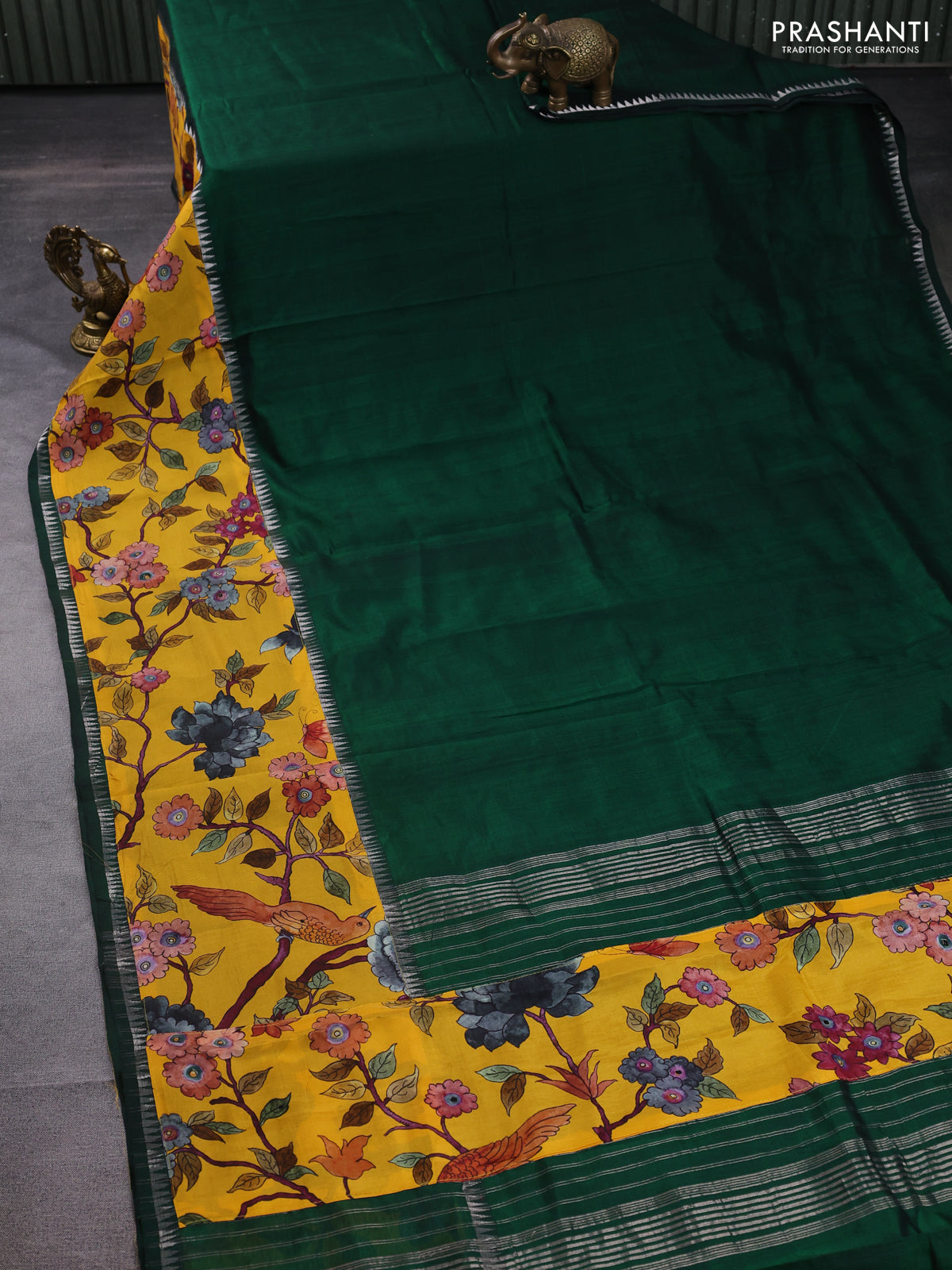 Mangalgiri silk cotton saree dark green and yellow with plain body and long kalamkari printed applique border
