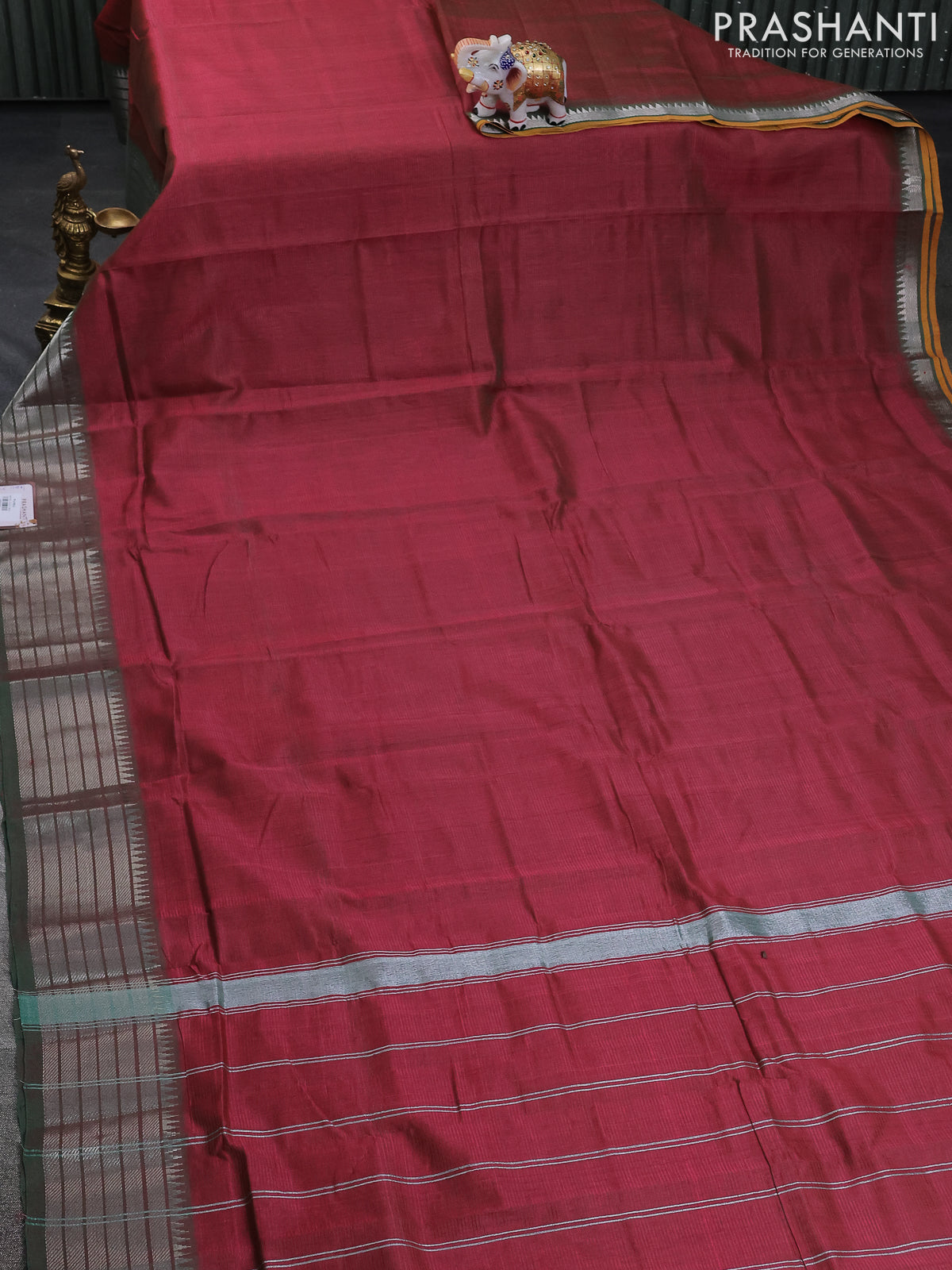 Mangalgiri silk cotton saree dual shade of maroon and green with plain body and silver zari woven border
