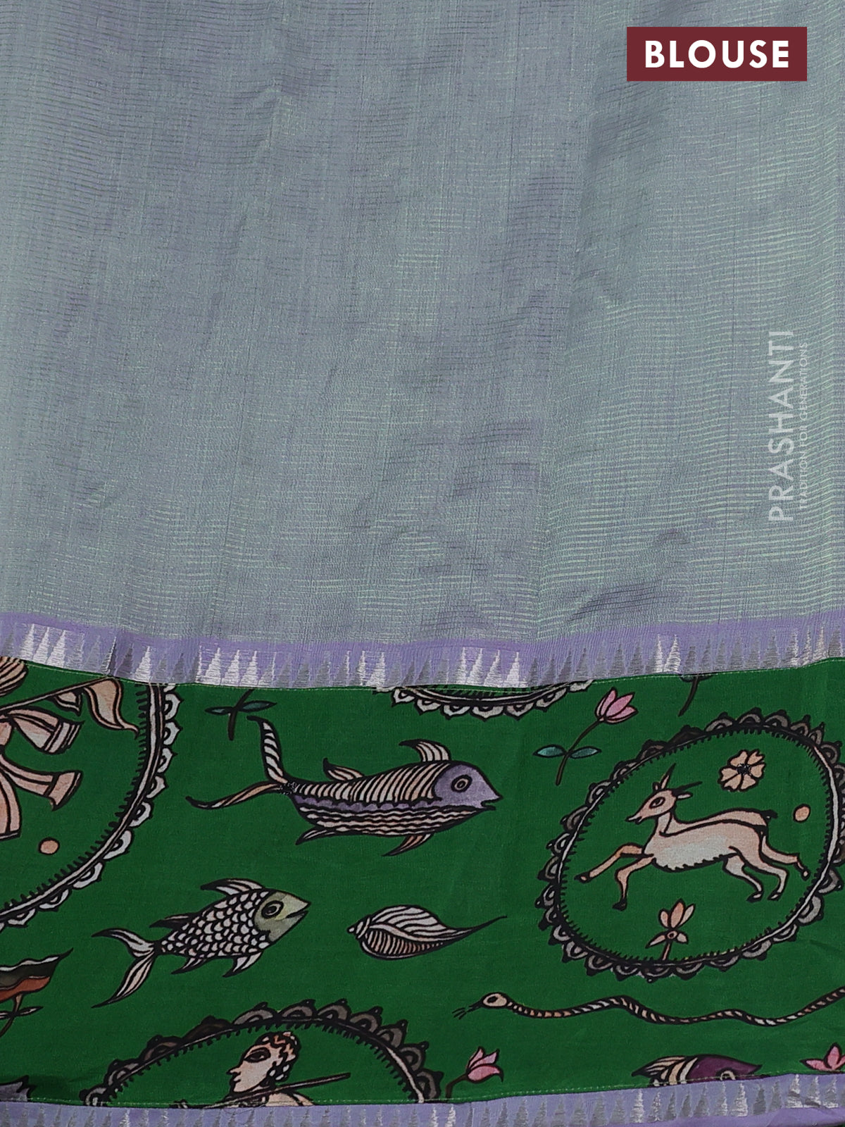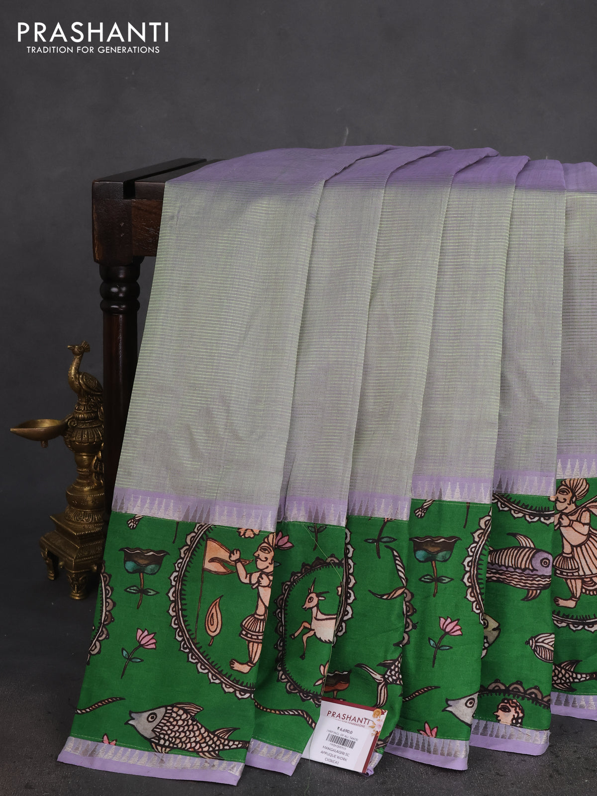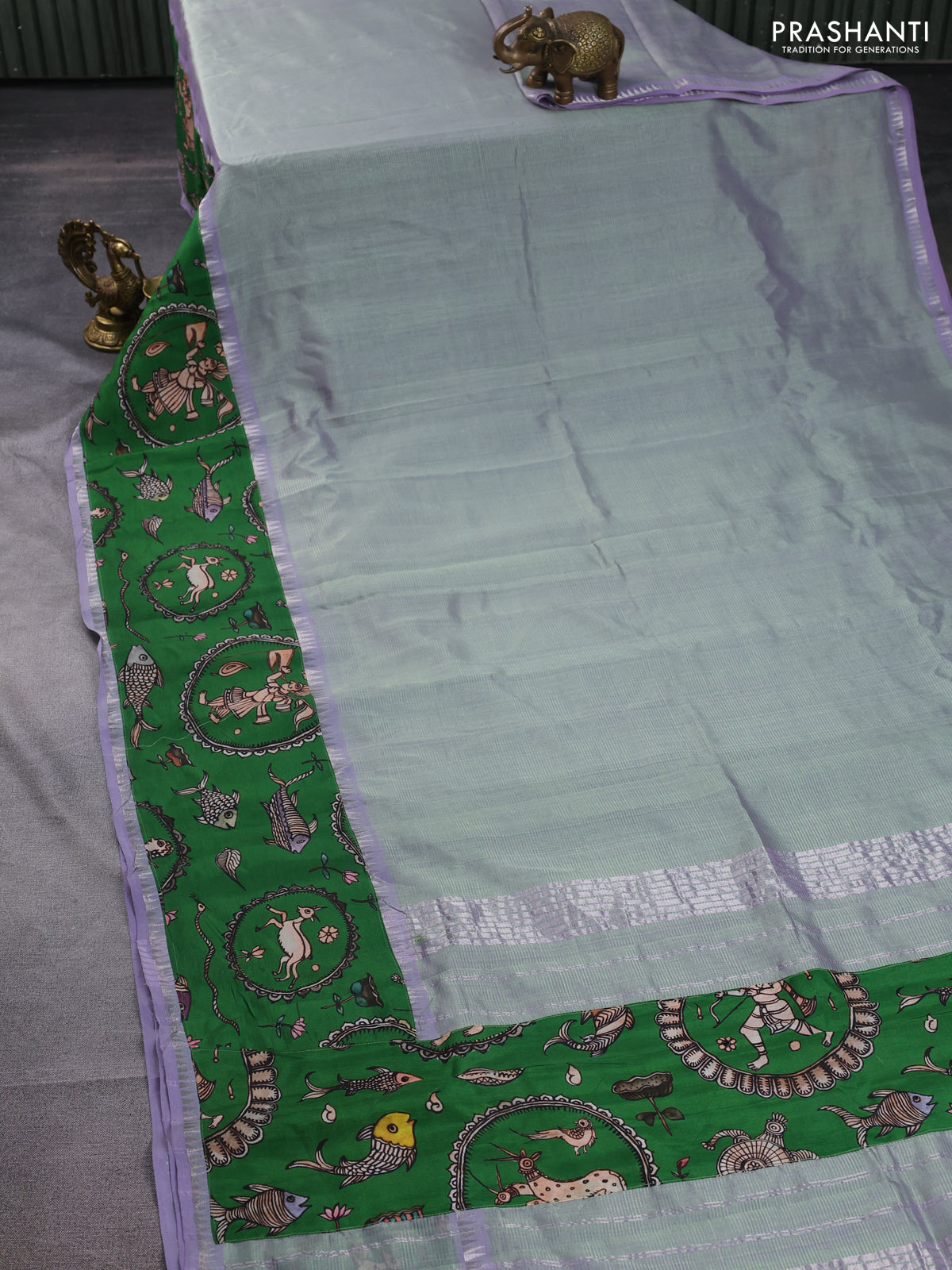 Mangalgiri silk cotton saree dual shade of pastel green and green with plain body and long kalamkari printed applique border
