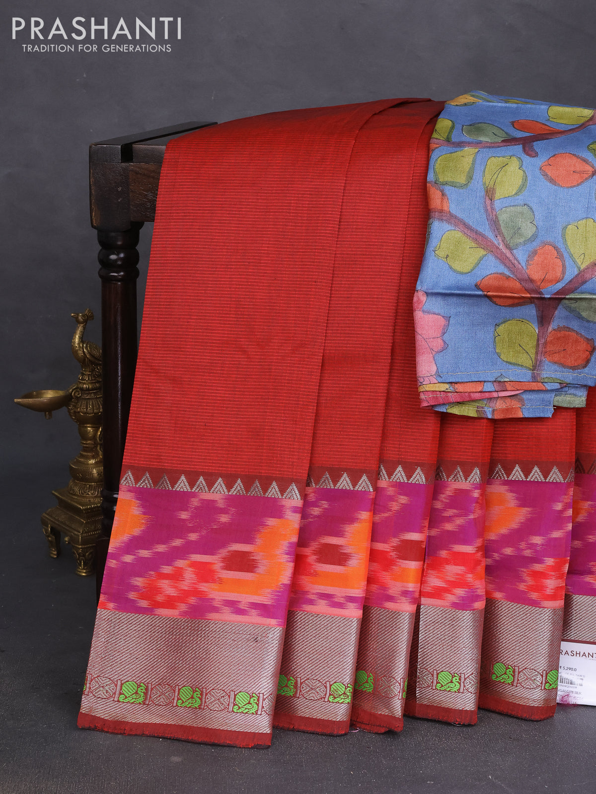 Mangalgiri silk cotton saree kumkum red and bluish grey with plain body and long ikat style silver zari woven border