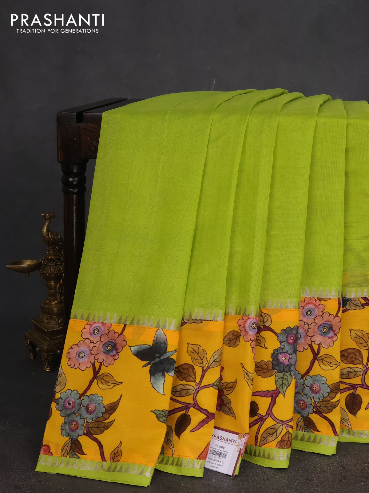 Mangalgiri silk cotton saree light green and yellow with plain body and long kalamkari printed applique border