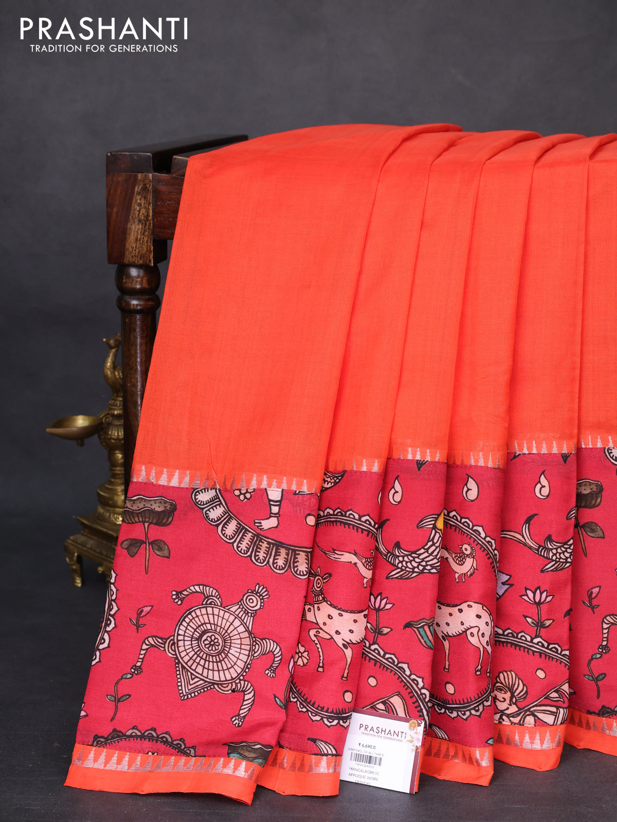 Mangalgiri silk cotton saree orange and maroon with plain body and temple design kalamkari printed applique border