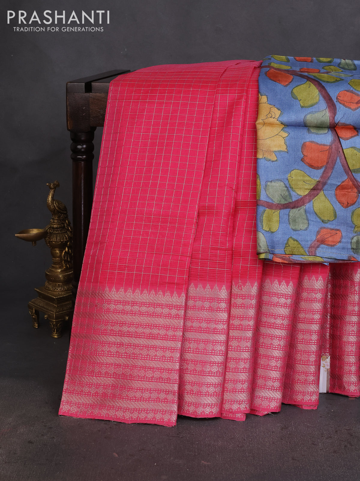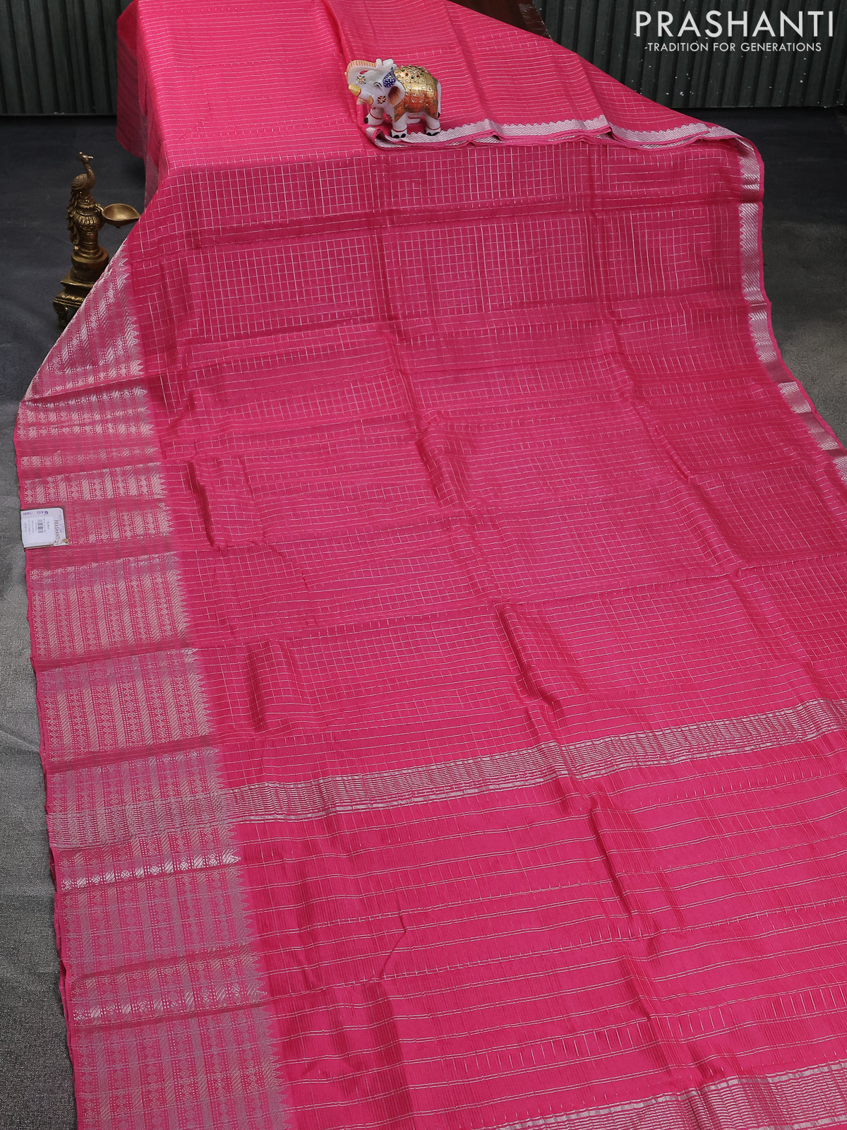 Mangalgiri silk cotton saree pink and bluish grey with allover silver zari checked pattern and long silver zari woven border