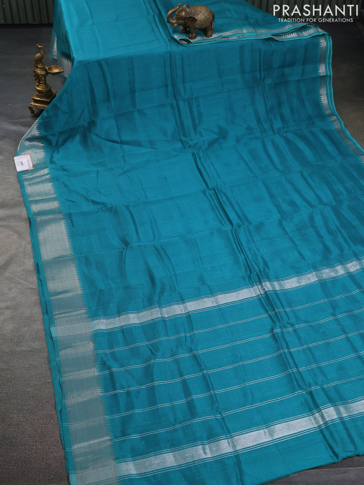 Mangalgiri silk cotton saree teal green and grey shade with plain body and silver zari woven border