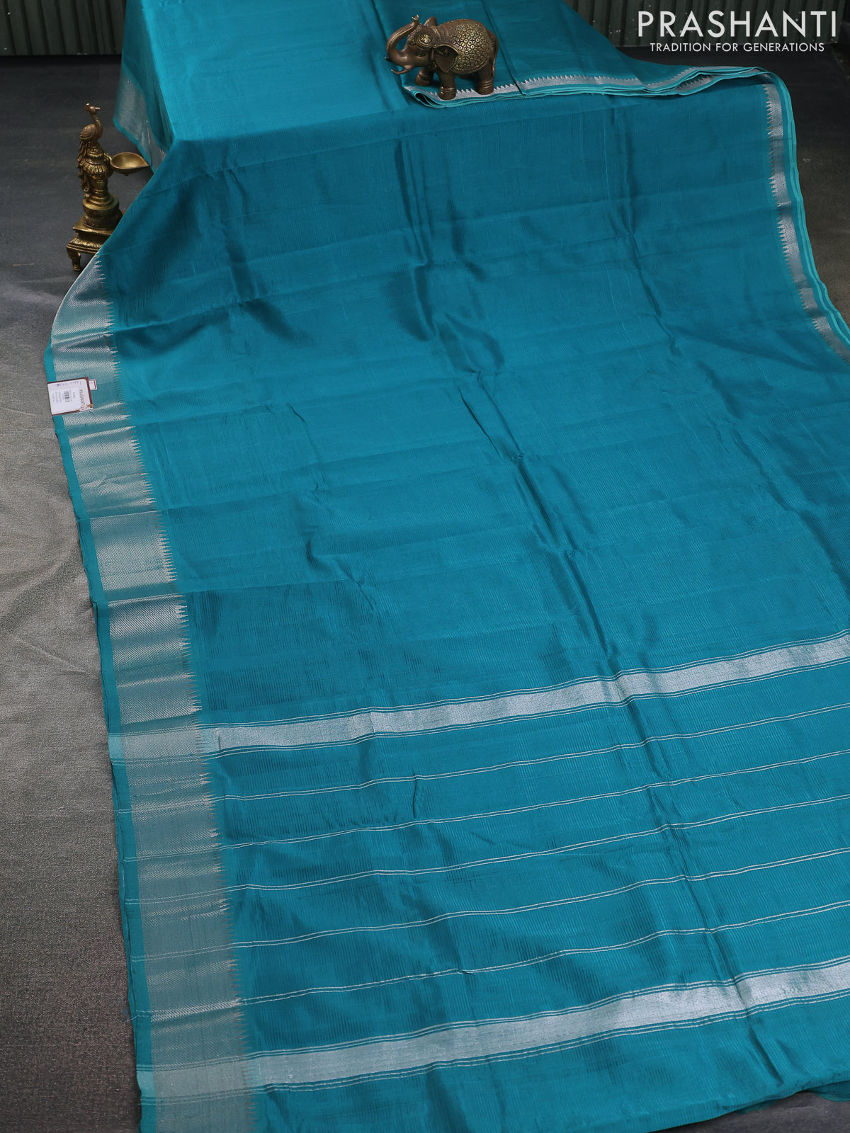 Mangalgiri silk cotton saree teal green and mustard yellow with plain body and silver zari woven border