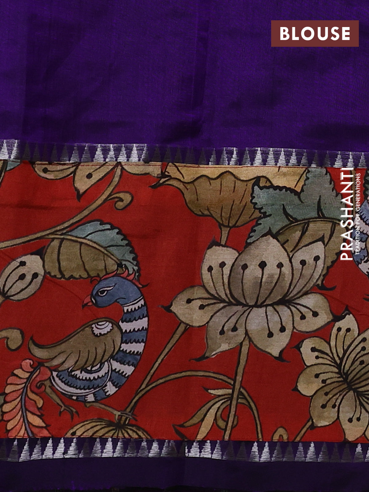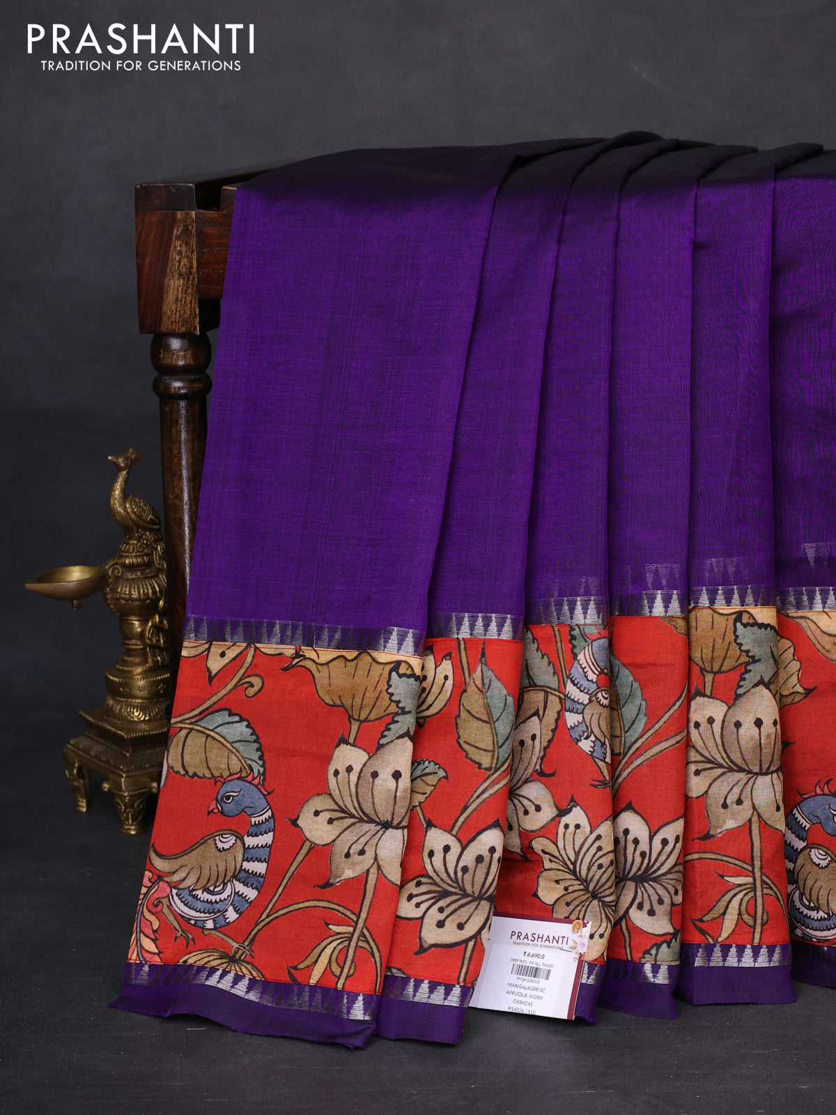 Mangalgiri silk cotton saree violet and red with plain body and temple design kalamkari printed applique border