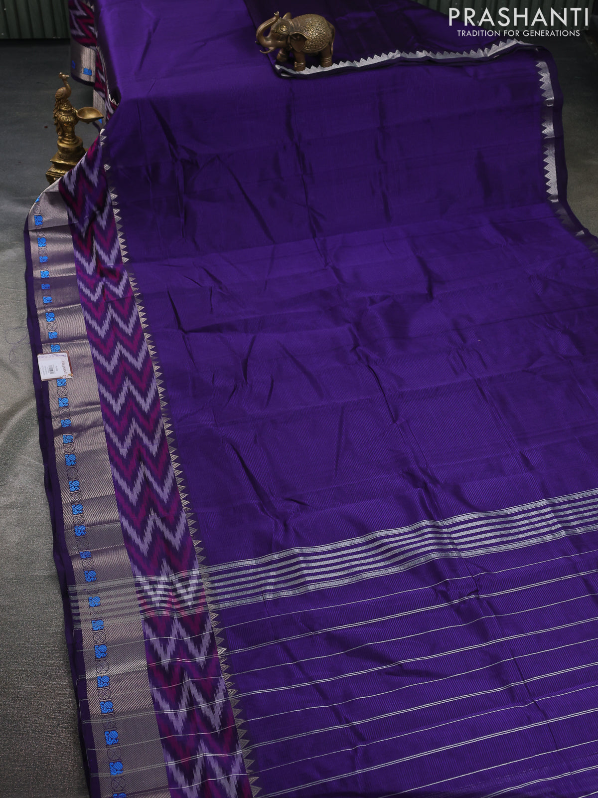 Mangalgiri silk cotton saree violet and rustic orange with plain body and long ikat style silver zari woven border