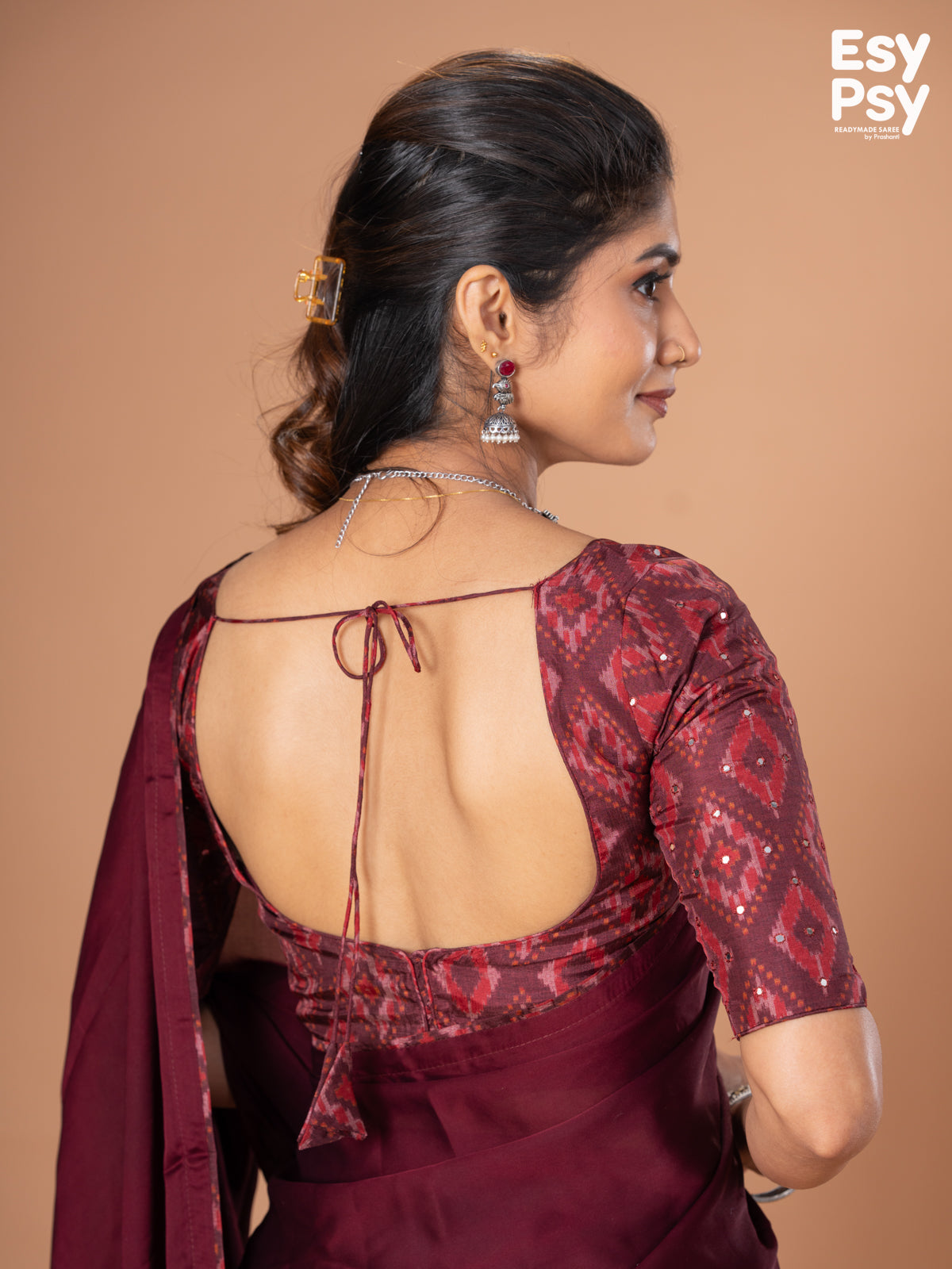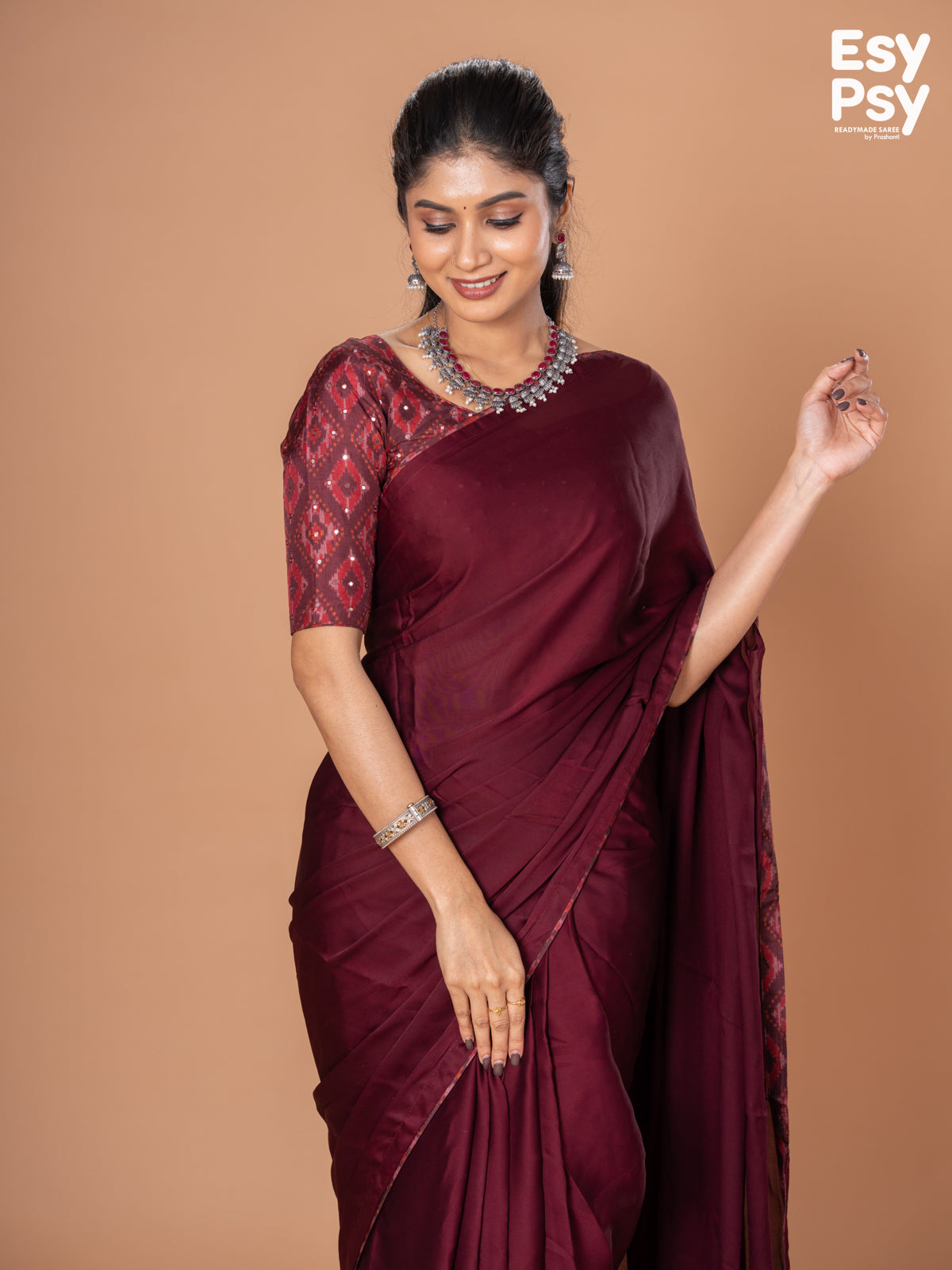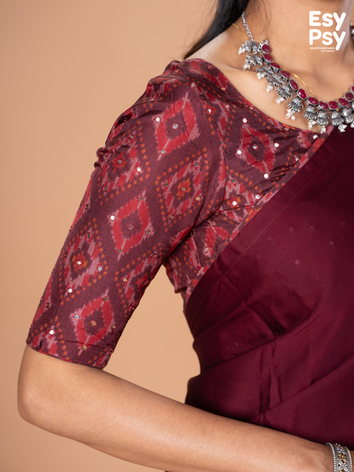 Maroon Satin Crepe readymade saree with readymade ikat printed blouse