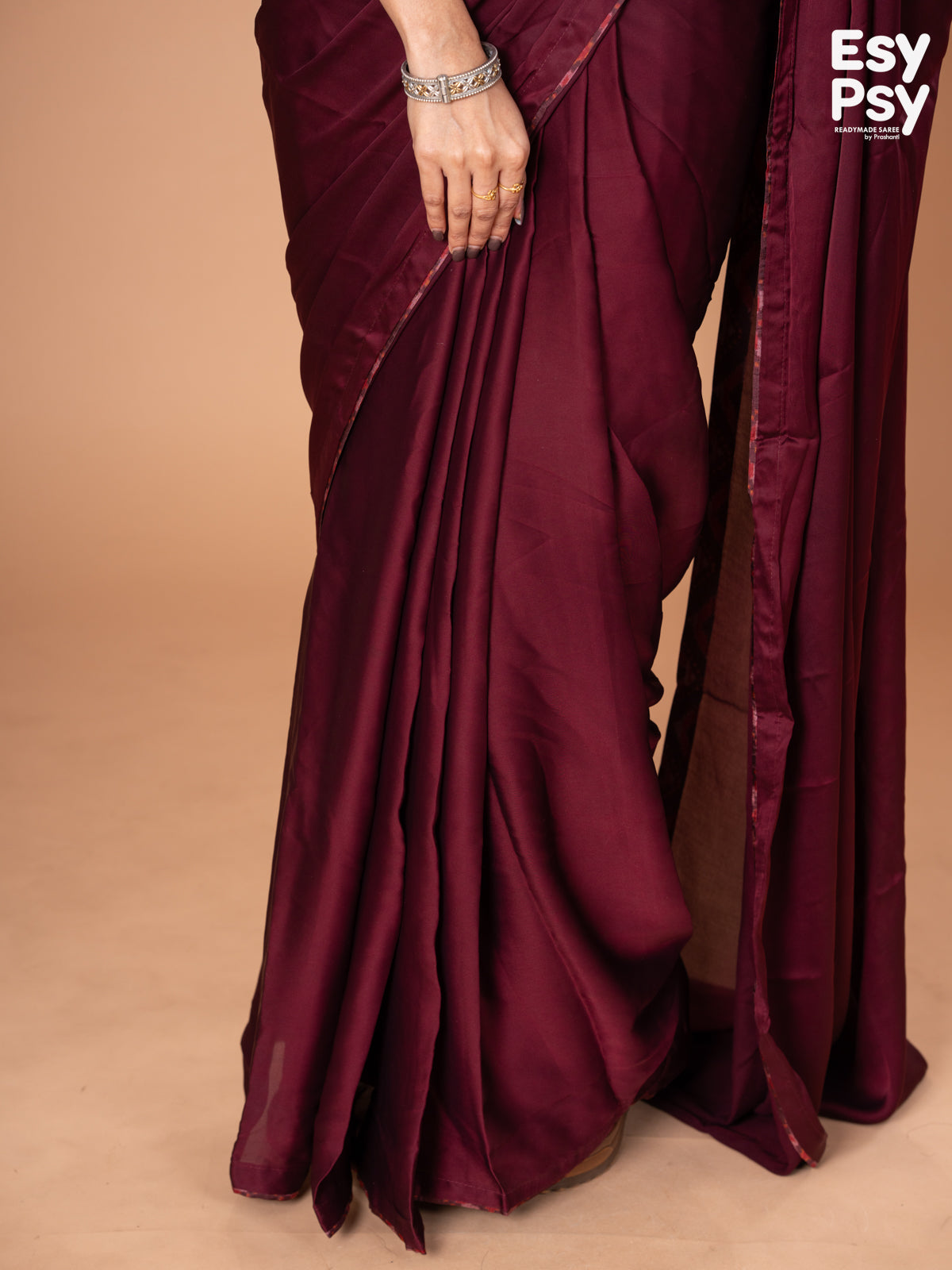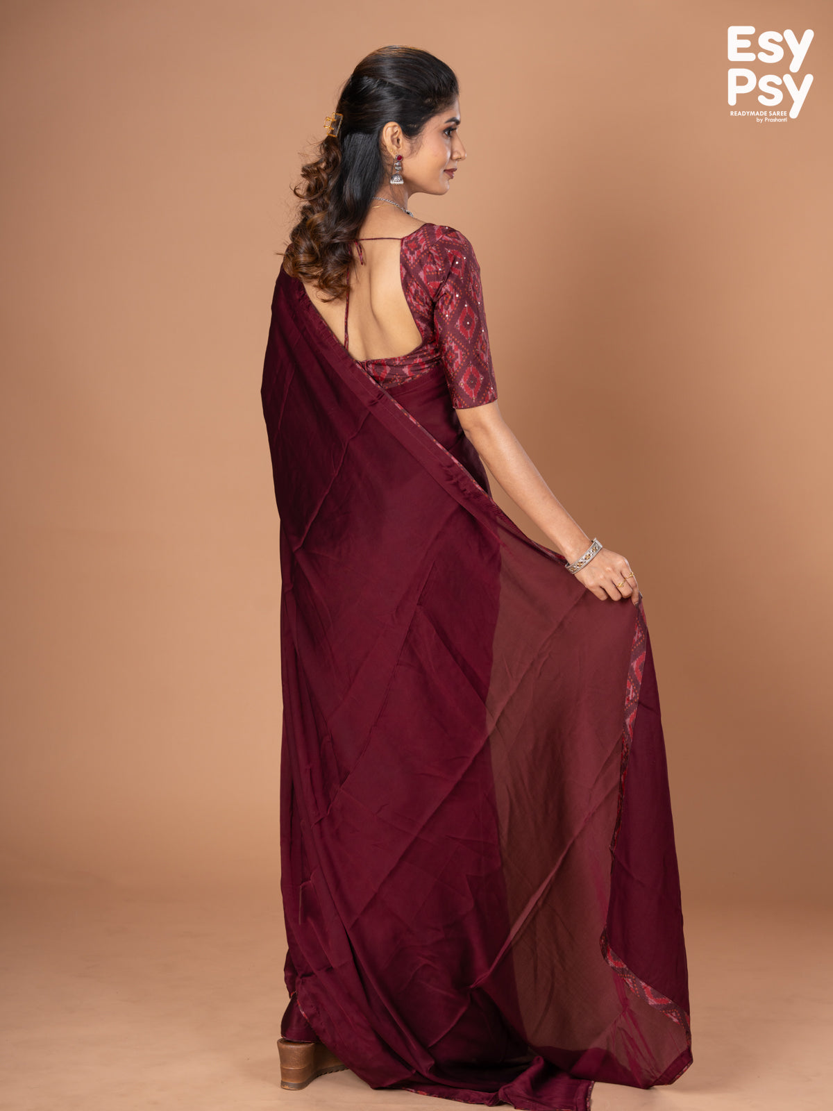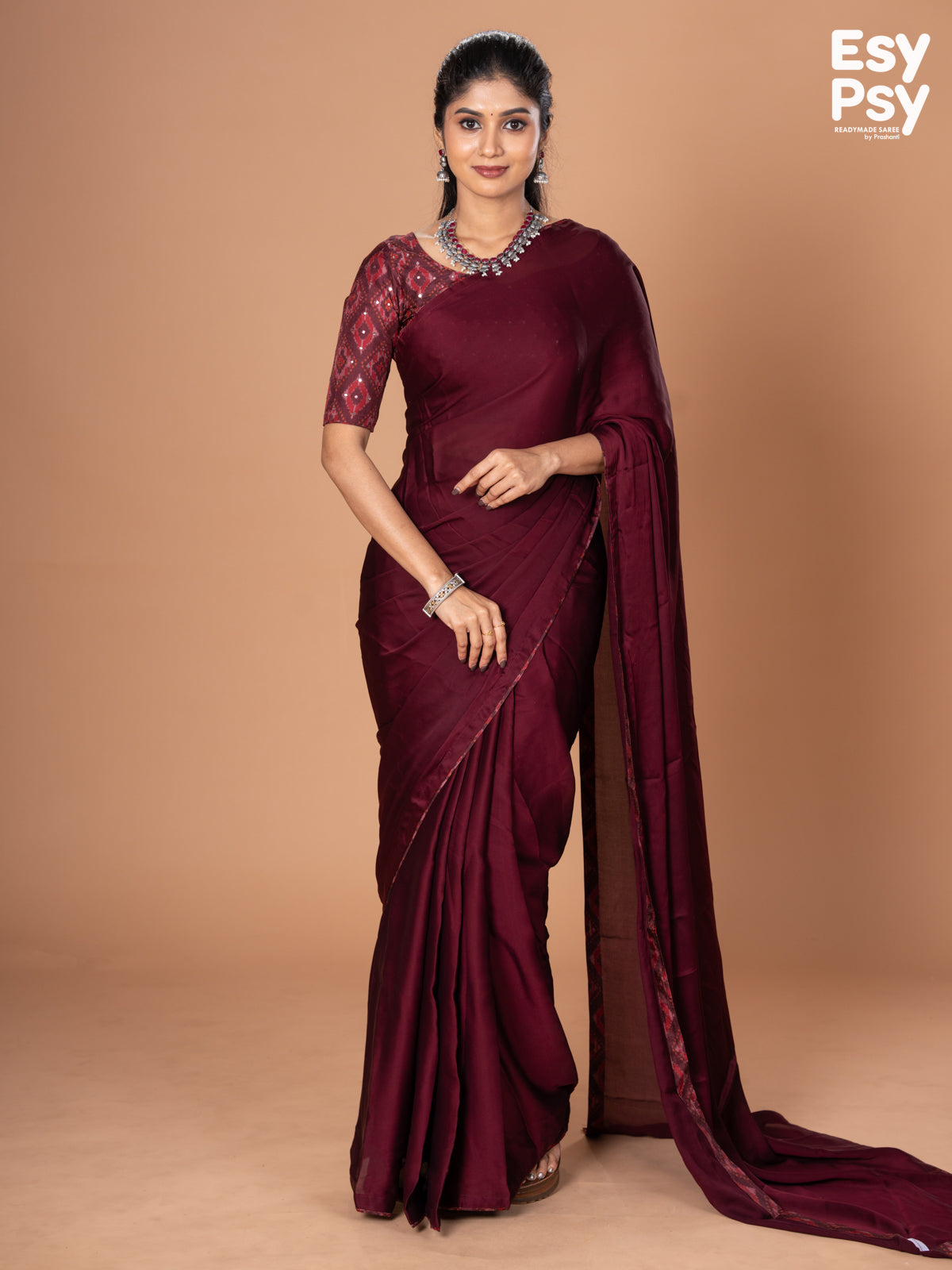 Maroon Satin Crepe readymade saree with readymade ikat printed blouse