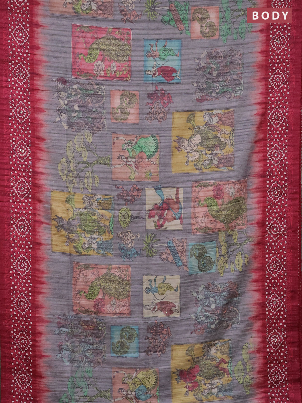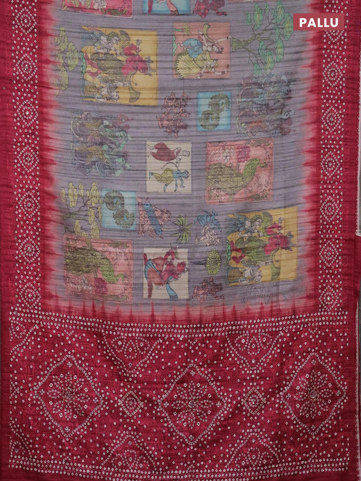 Matka tussar saree grey and maroon with allover kalamkari prints and bandhani printed & embroidery work border