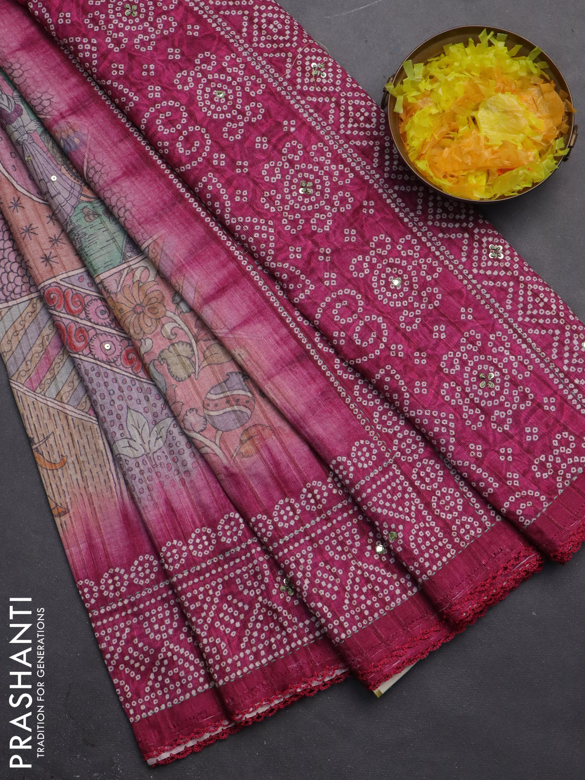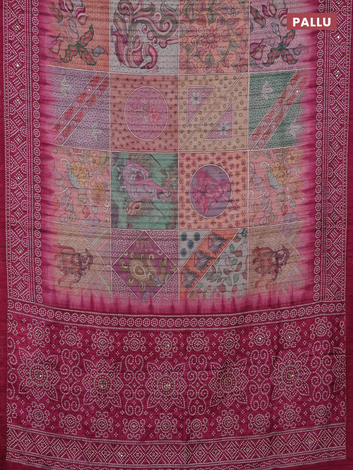 Matka tussar saree multi colour and magenta pink with allover kalamkari prints and bandhani printed & embroidery work border