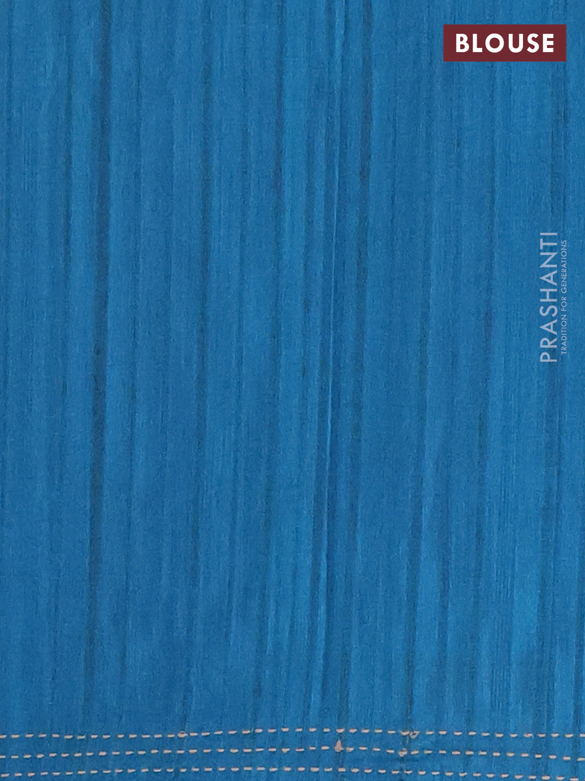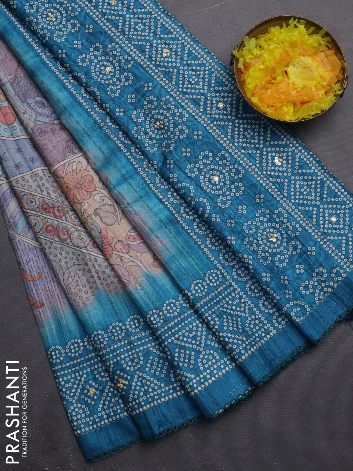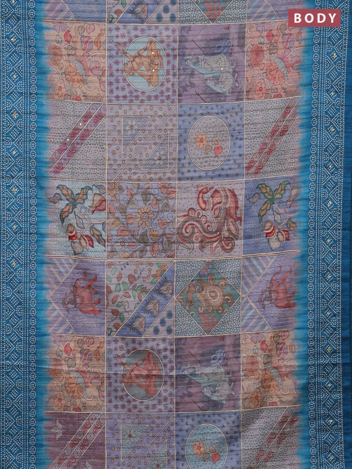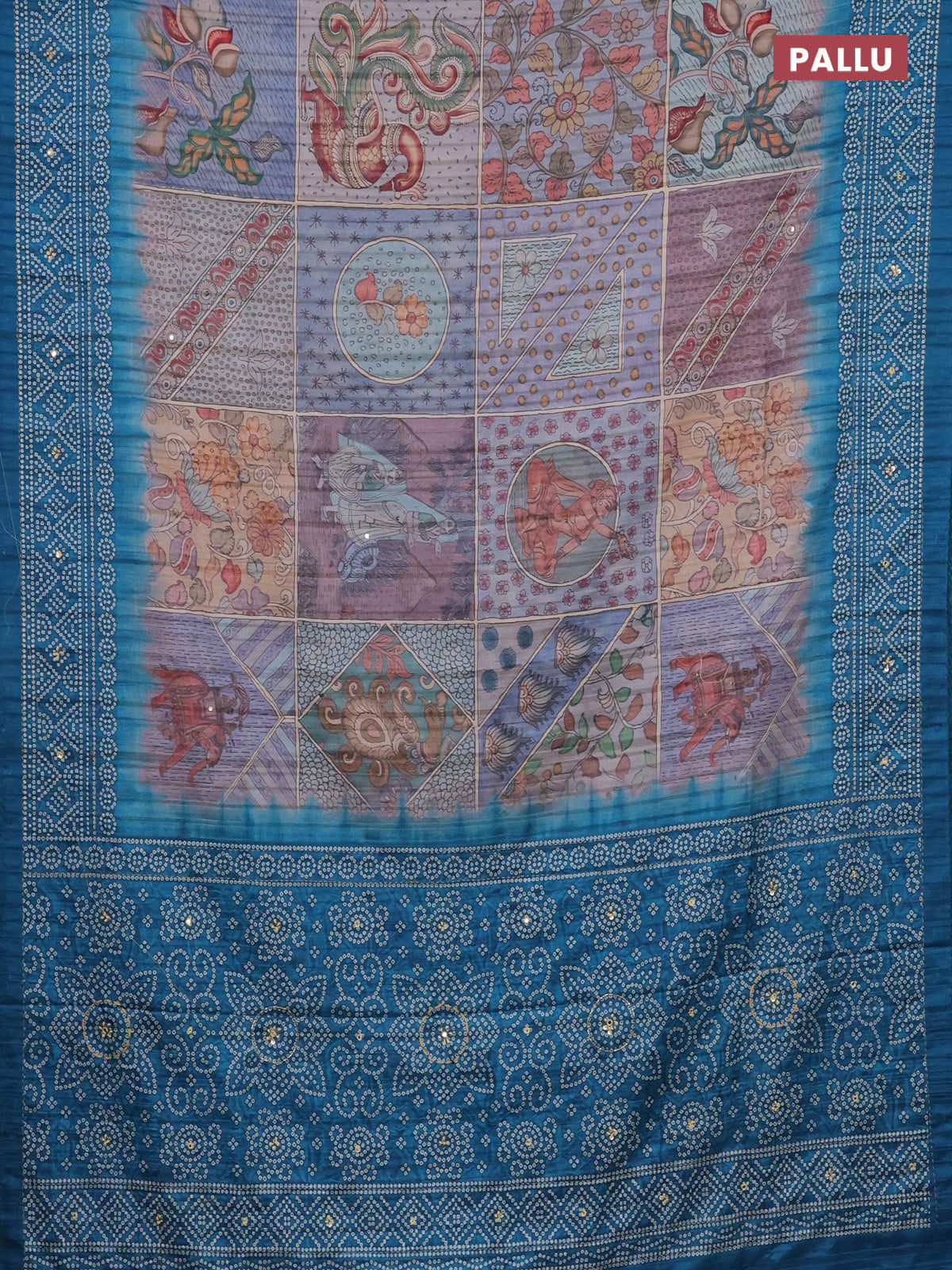Matka tussar saree multi colour and peacock blue with allover kalamkari prints and bandhani printed & embroidery work border