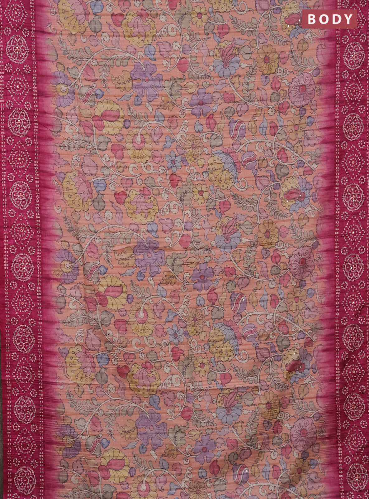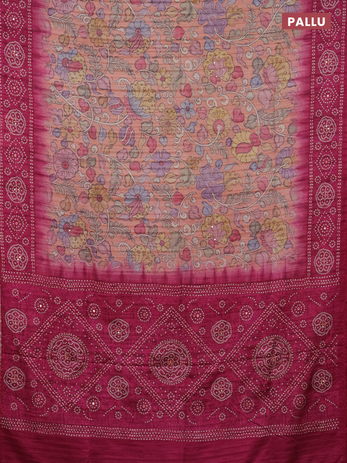 Matka tussar saree peach shade and magenta pink with allover kalamkari prints and bandhani printed & embroidery work border