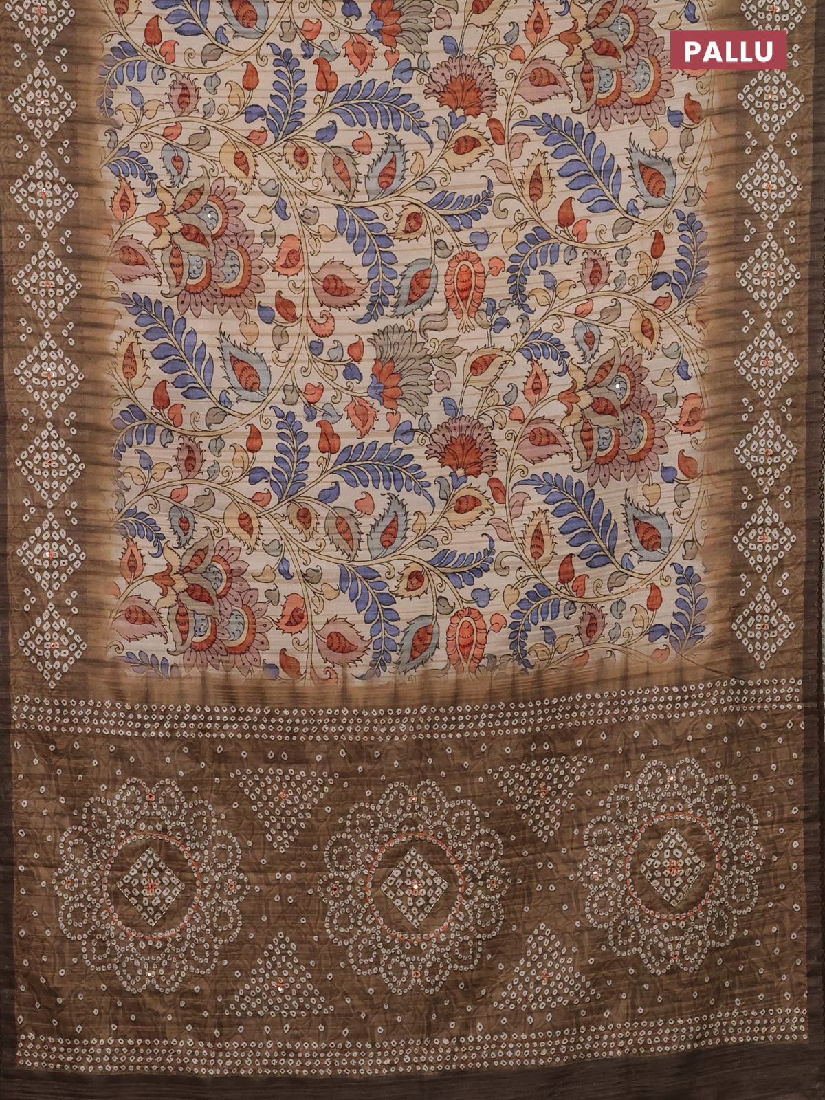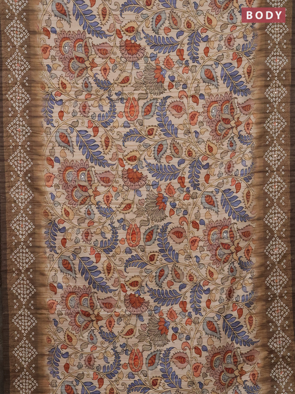 Matka tussar saree sandal and dark mehendi green with allover kalamkari prints and bandhani printed & embroidery work border