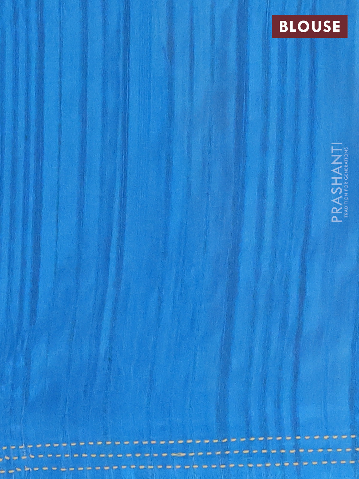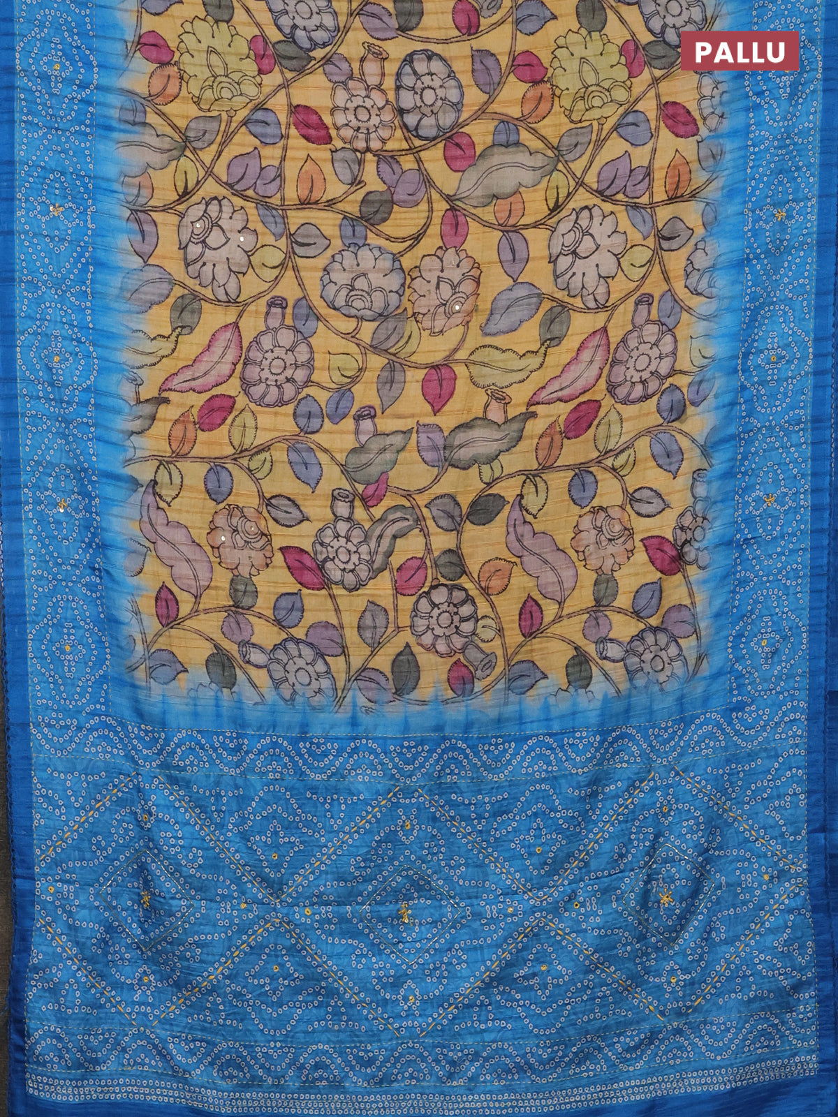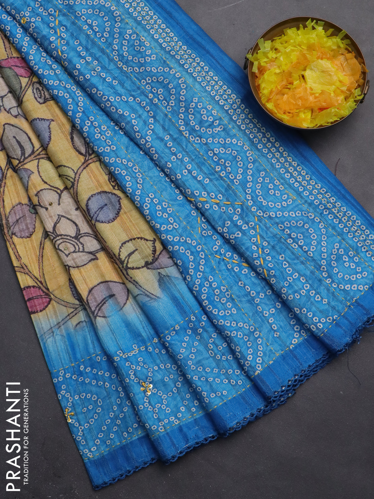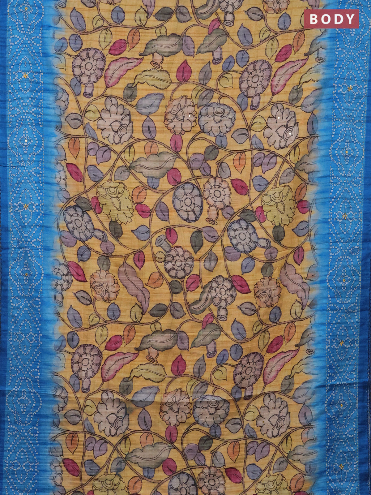 Matka tussar saree yellow and cs blue with allover kalamkari prints and bandhani printed & embroidery work border