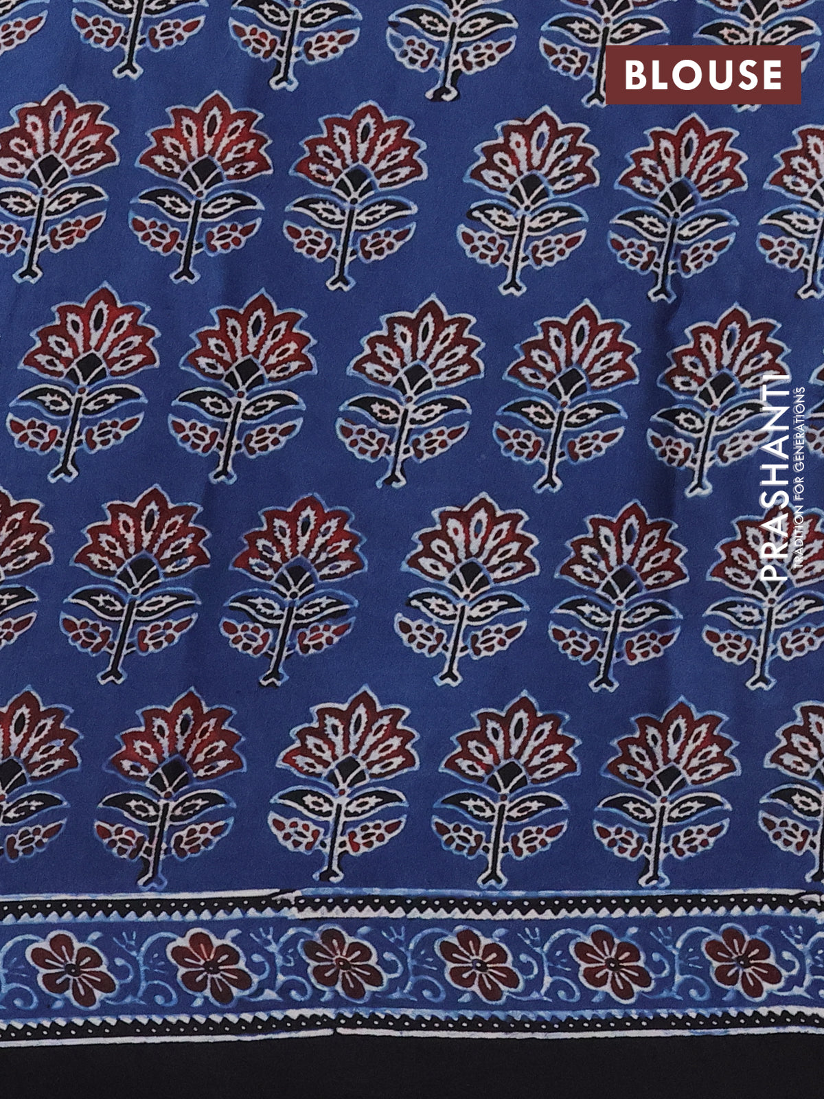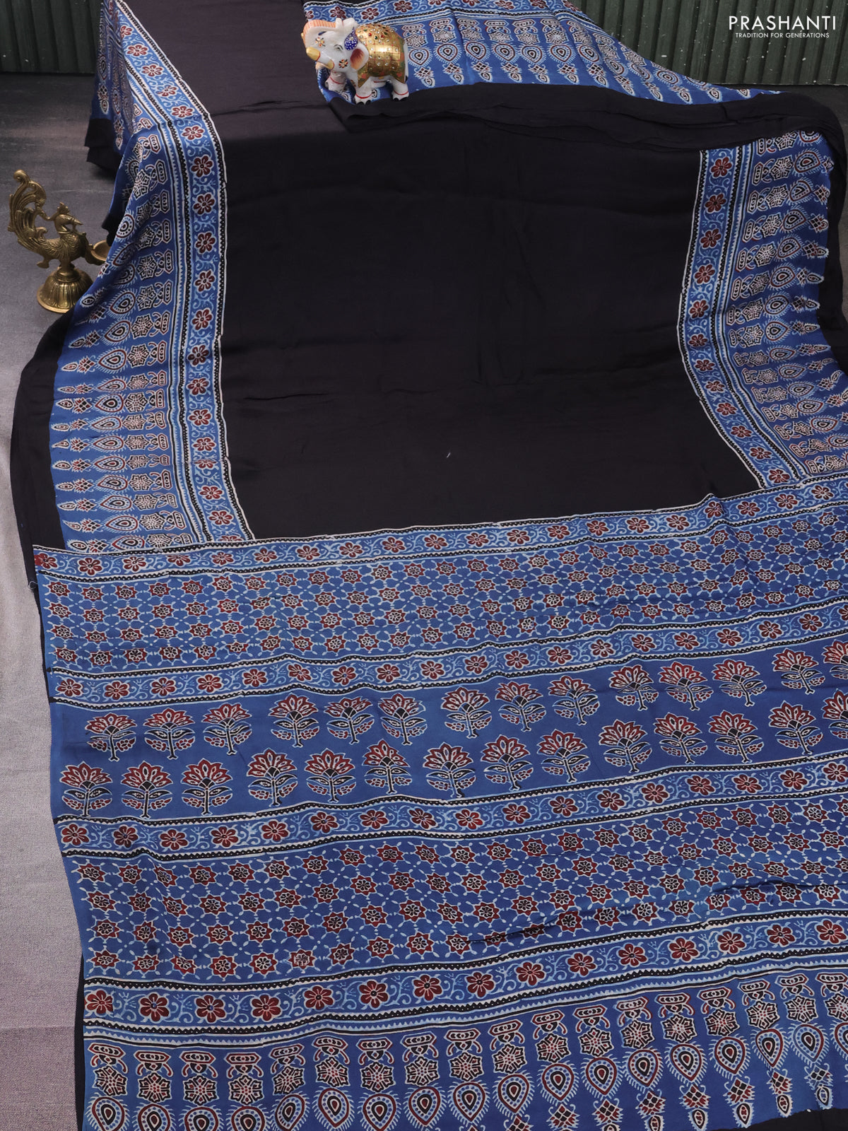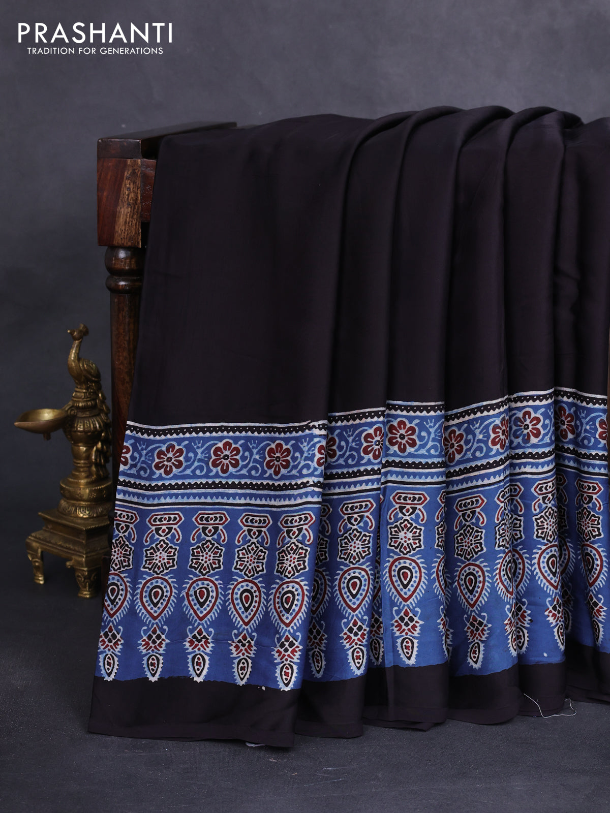 Modal silk saree black and blue with plain body and ajrakh printed border & pallu