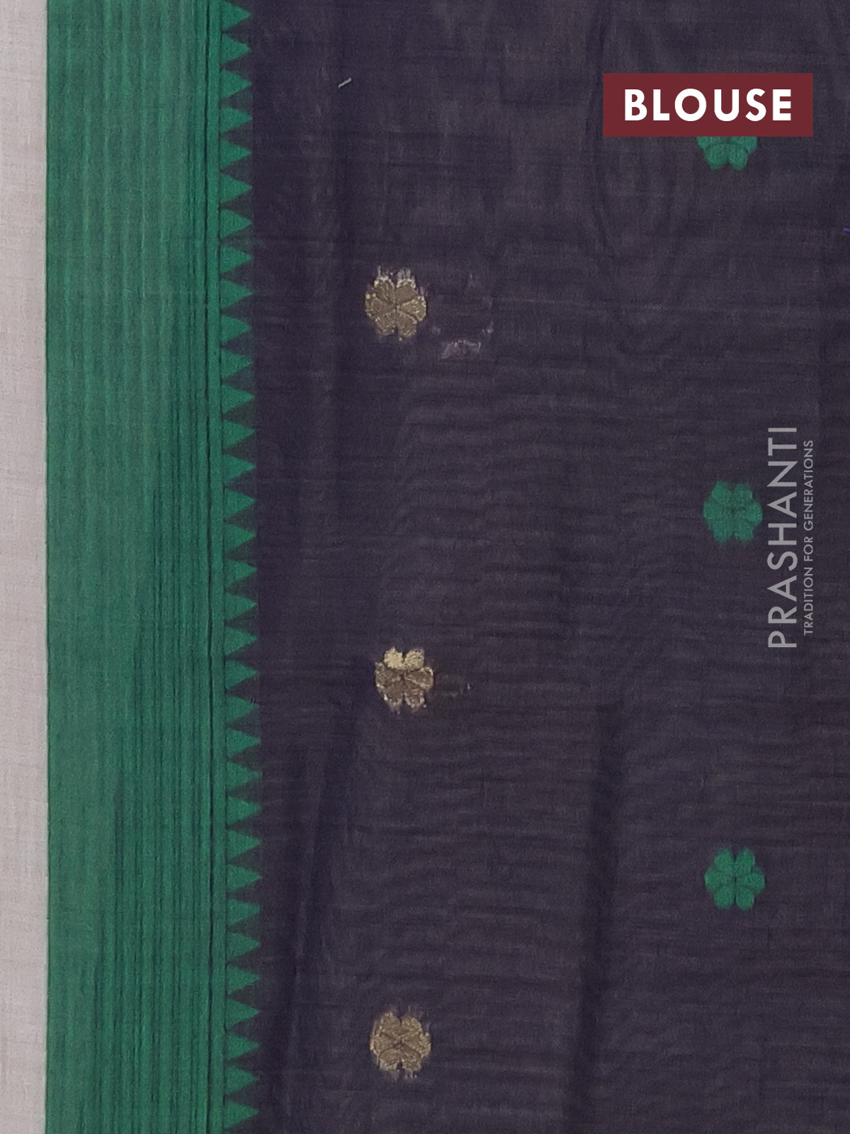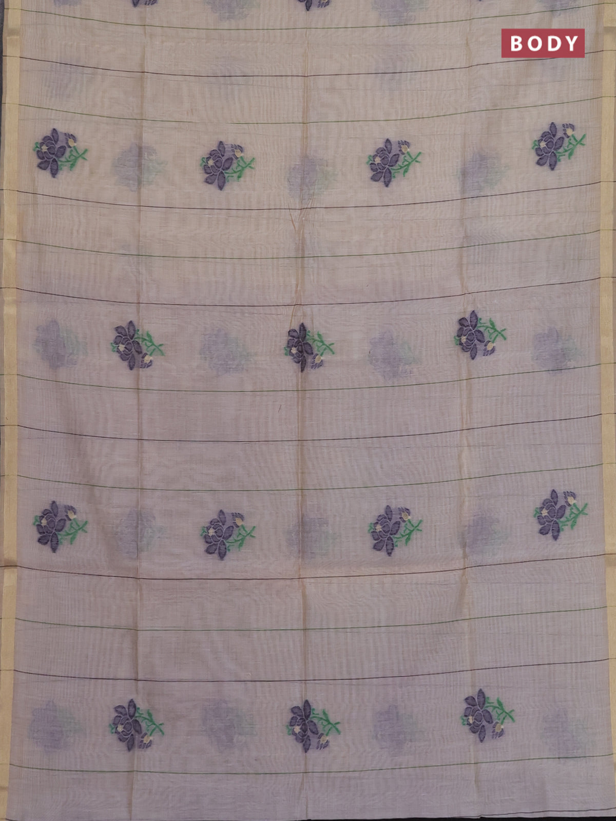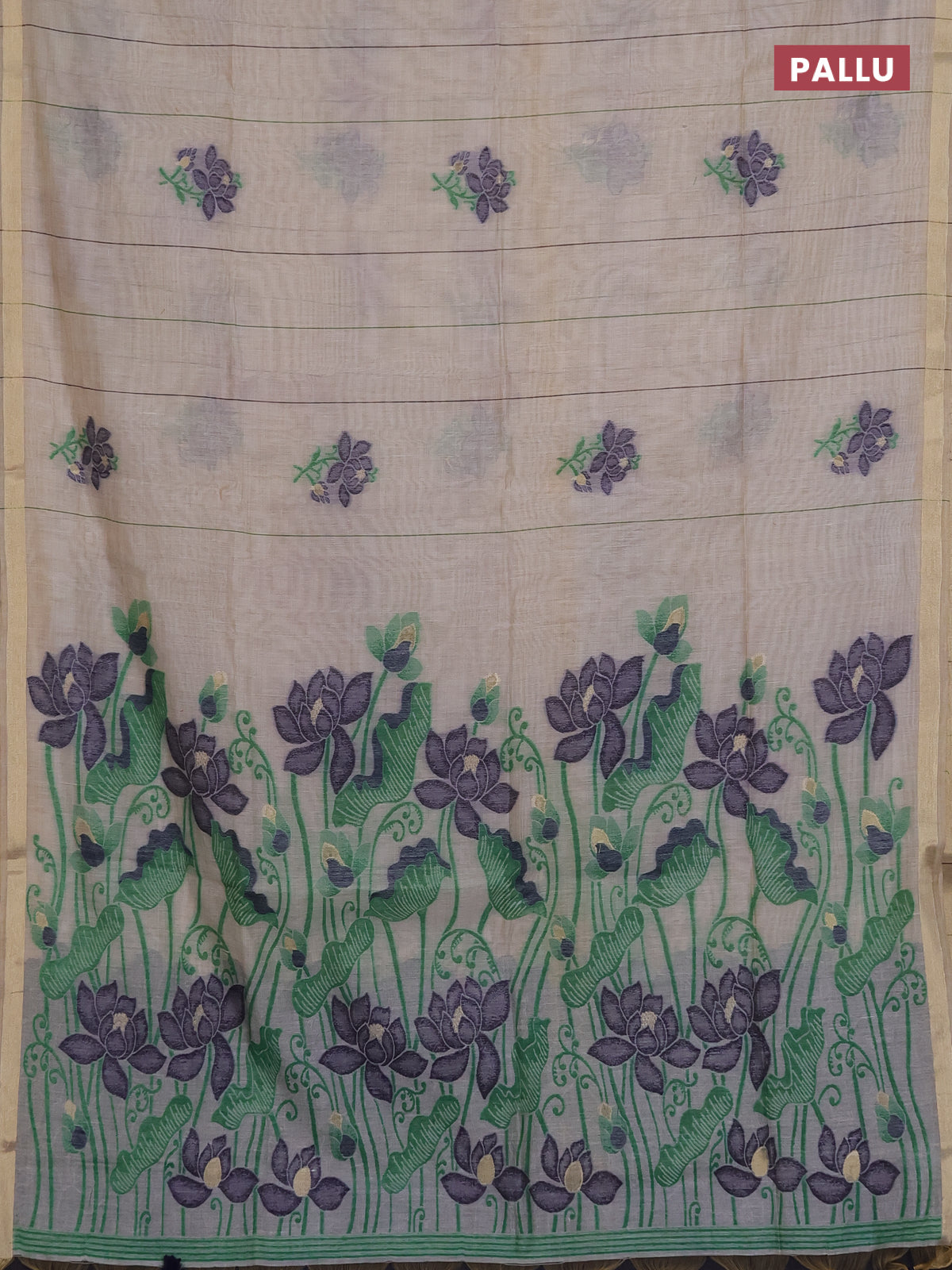 Munga cotton saree beige and navy blue with thread woven floral buttas and floral design weaving pallu