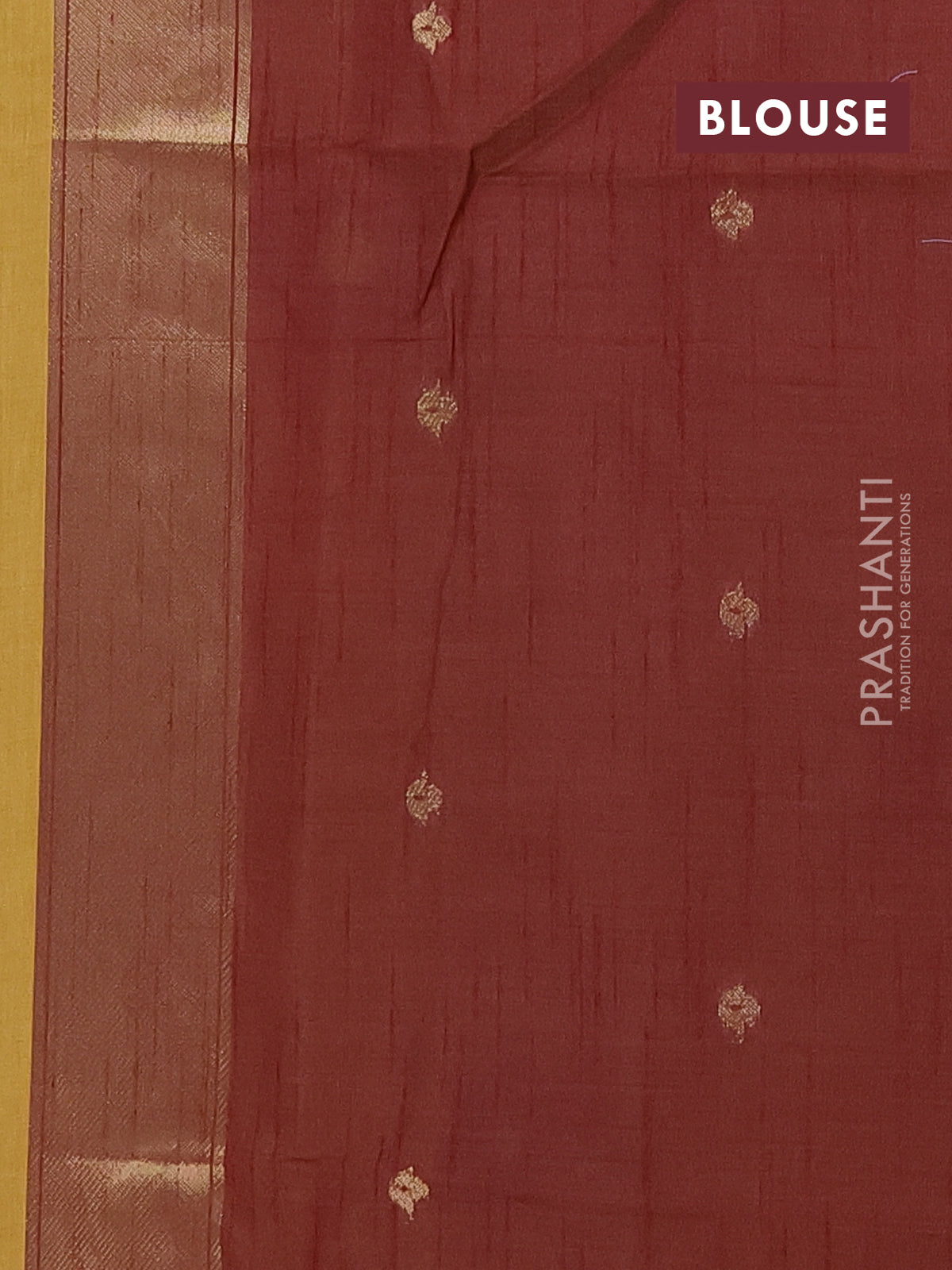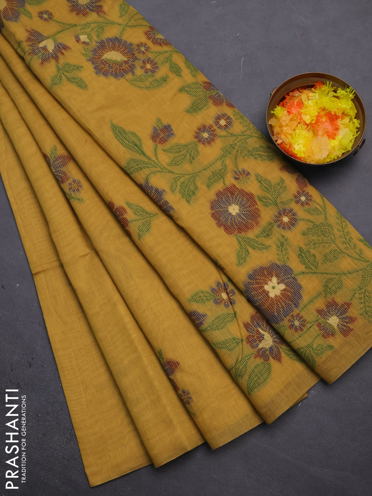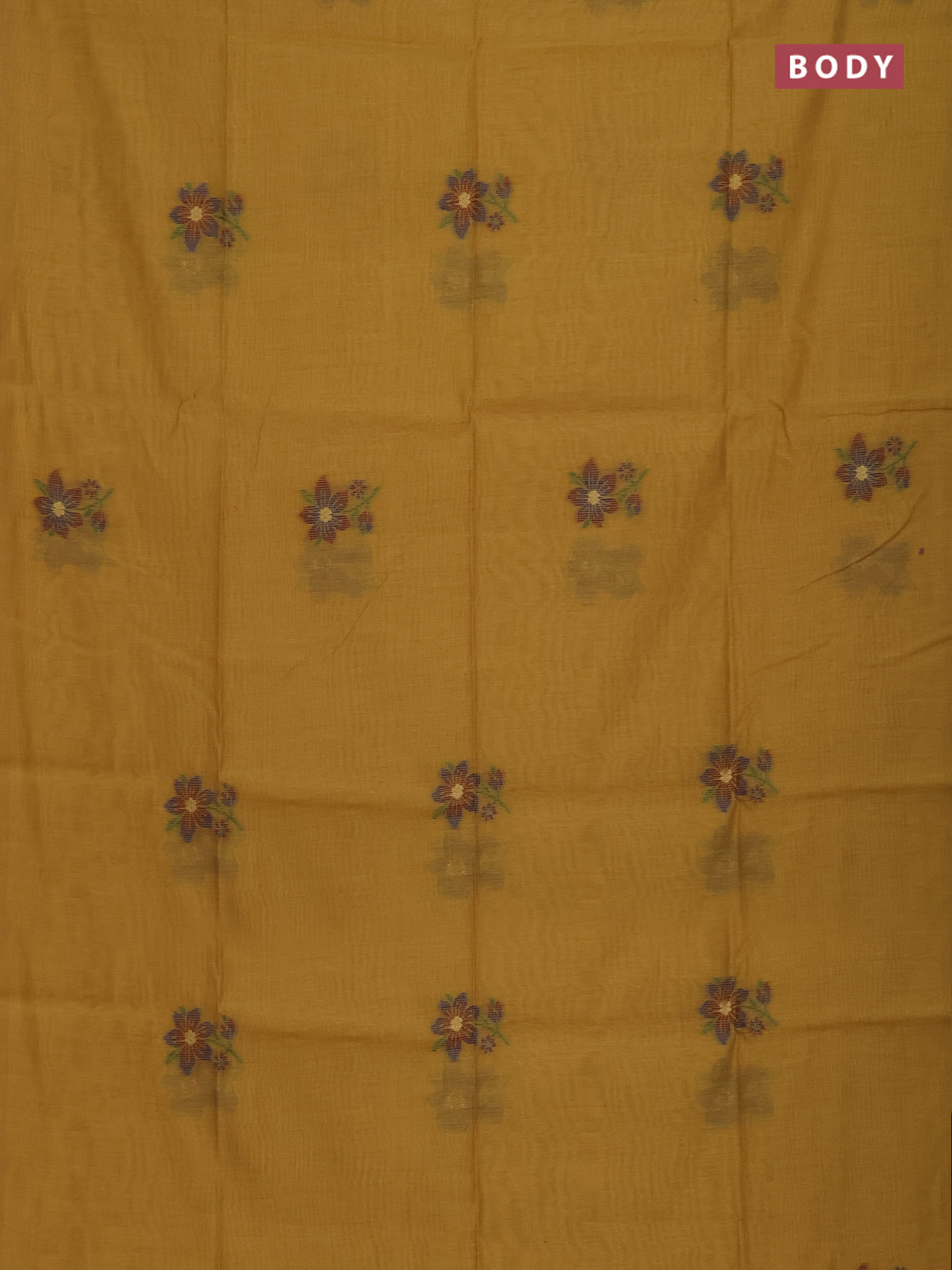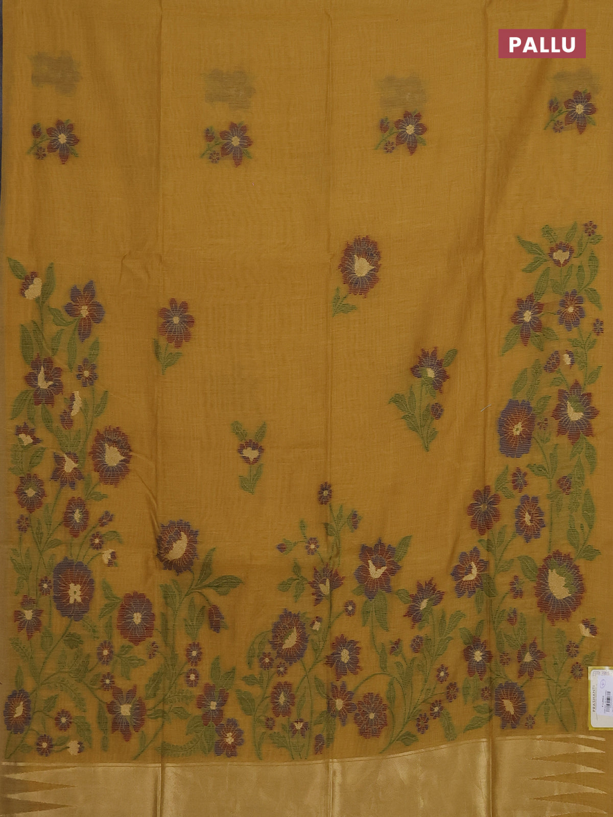 Munga cotton saree mustard yellow and maroon with thread woven floral buttas and floral design weaving pallu
