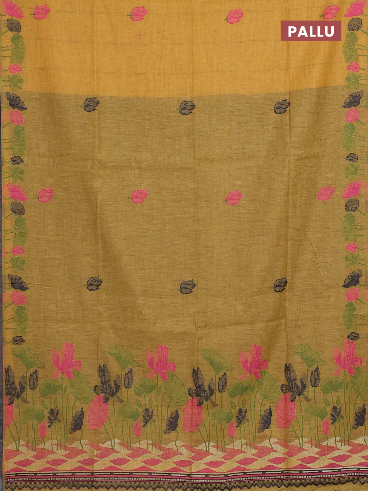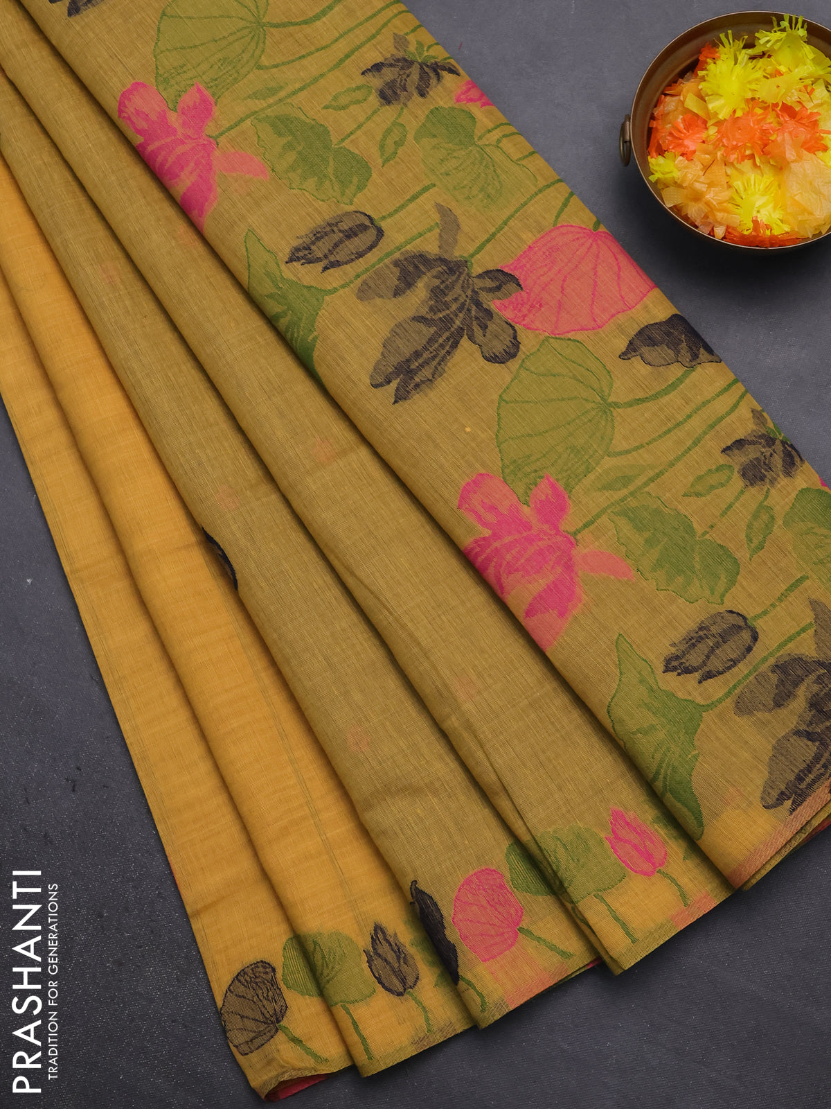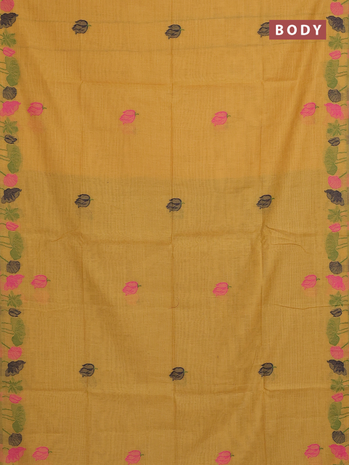 Munga cotton saree mustard yellow with thread woven floral buttas in borderless style