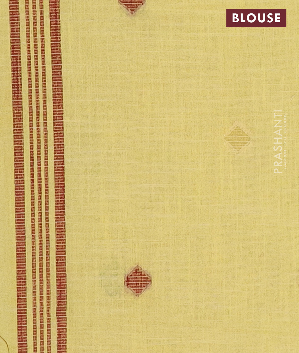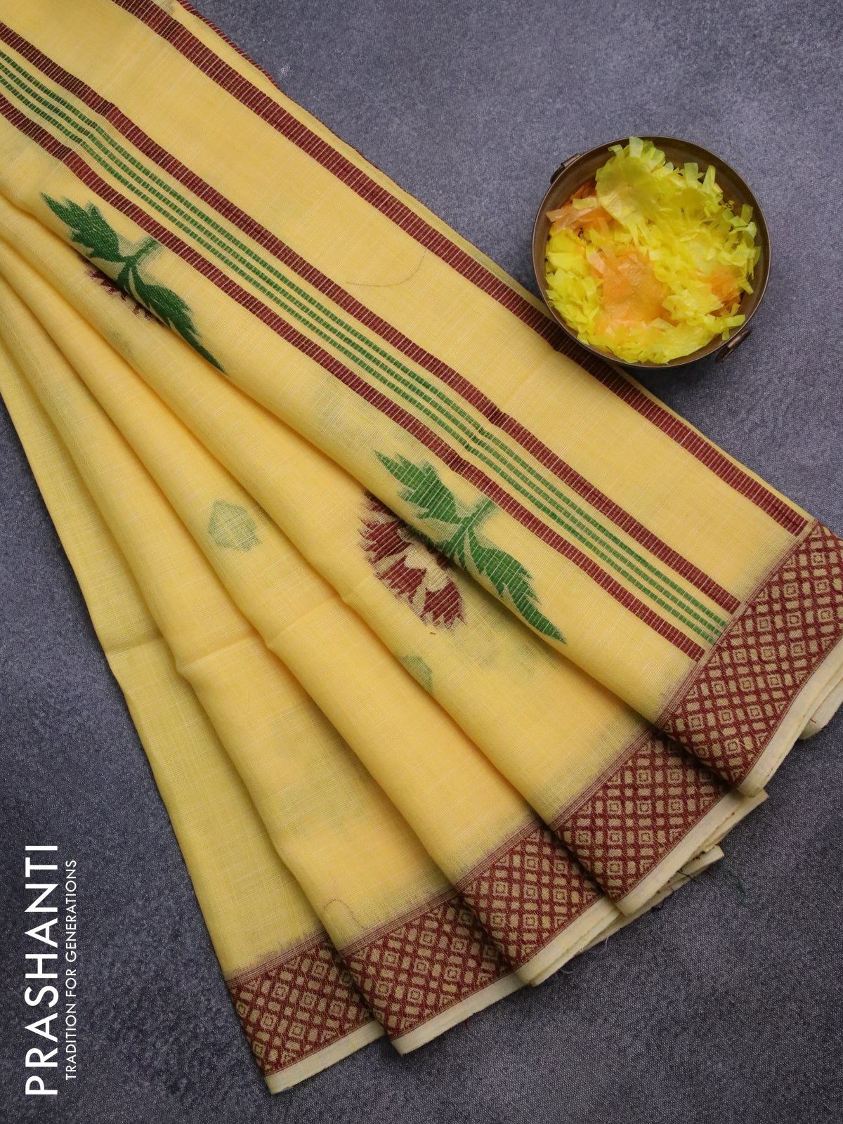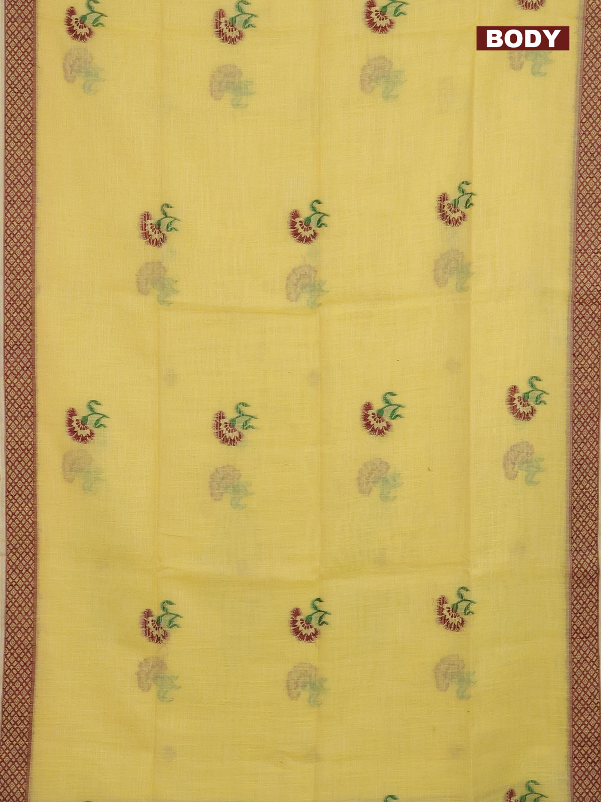 Munga linen saree yellow and maroon with thread woven floral buttas and thread woven border