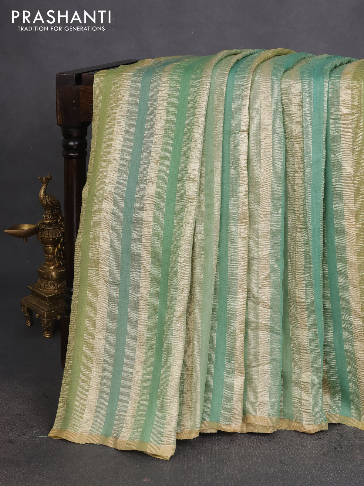 Munga silk saree green shade with allover zari woven stripes pattern in borderless style