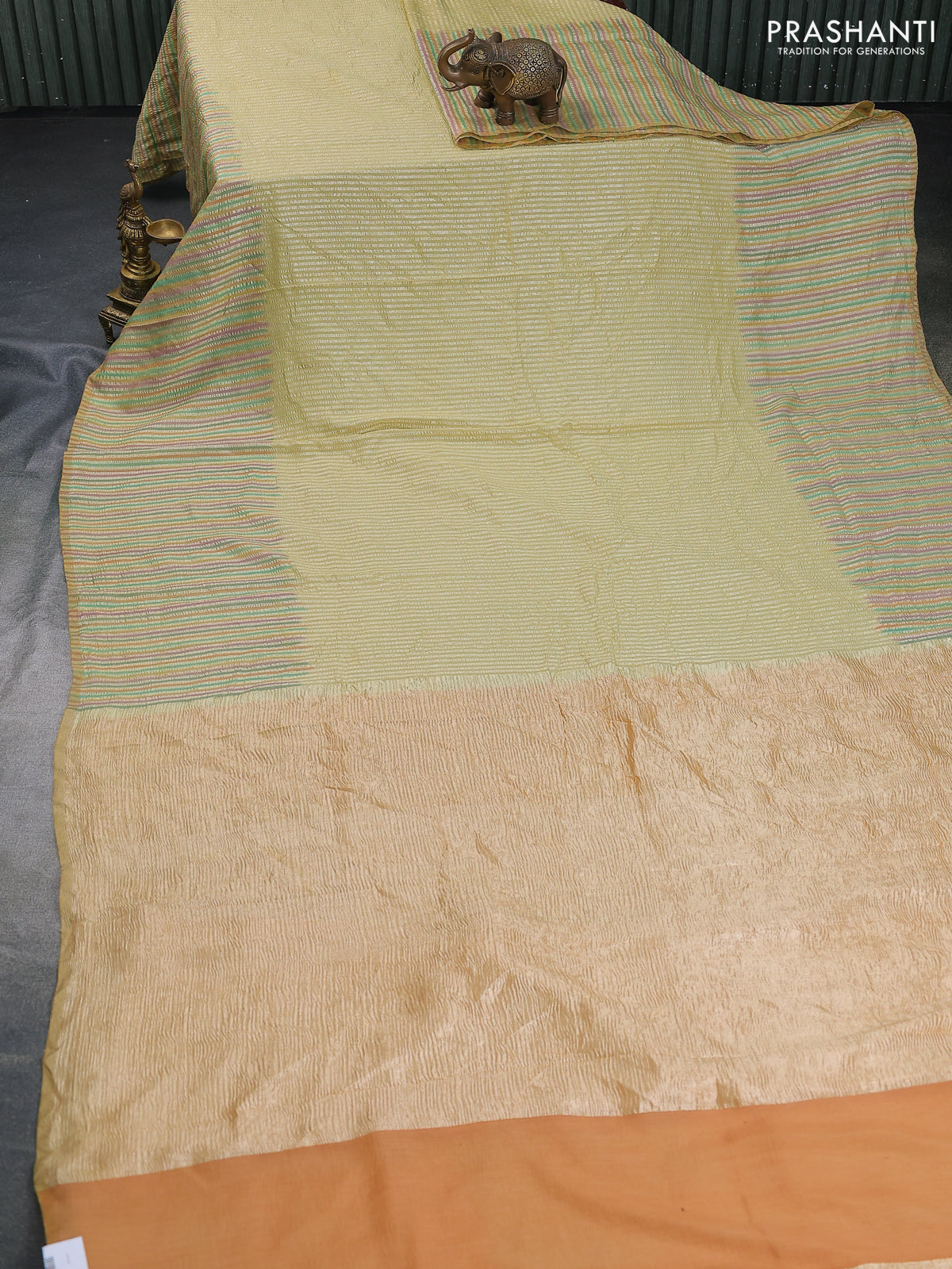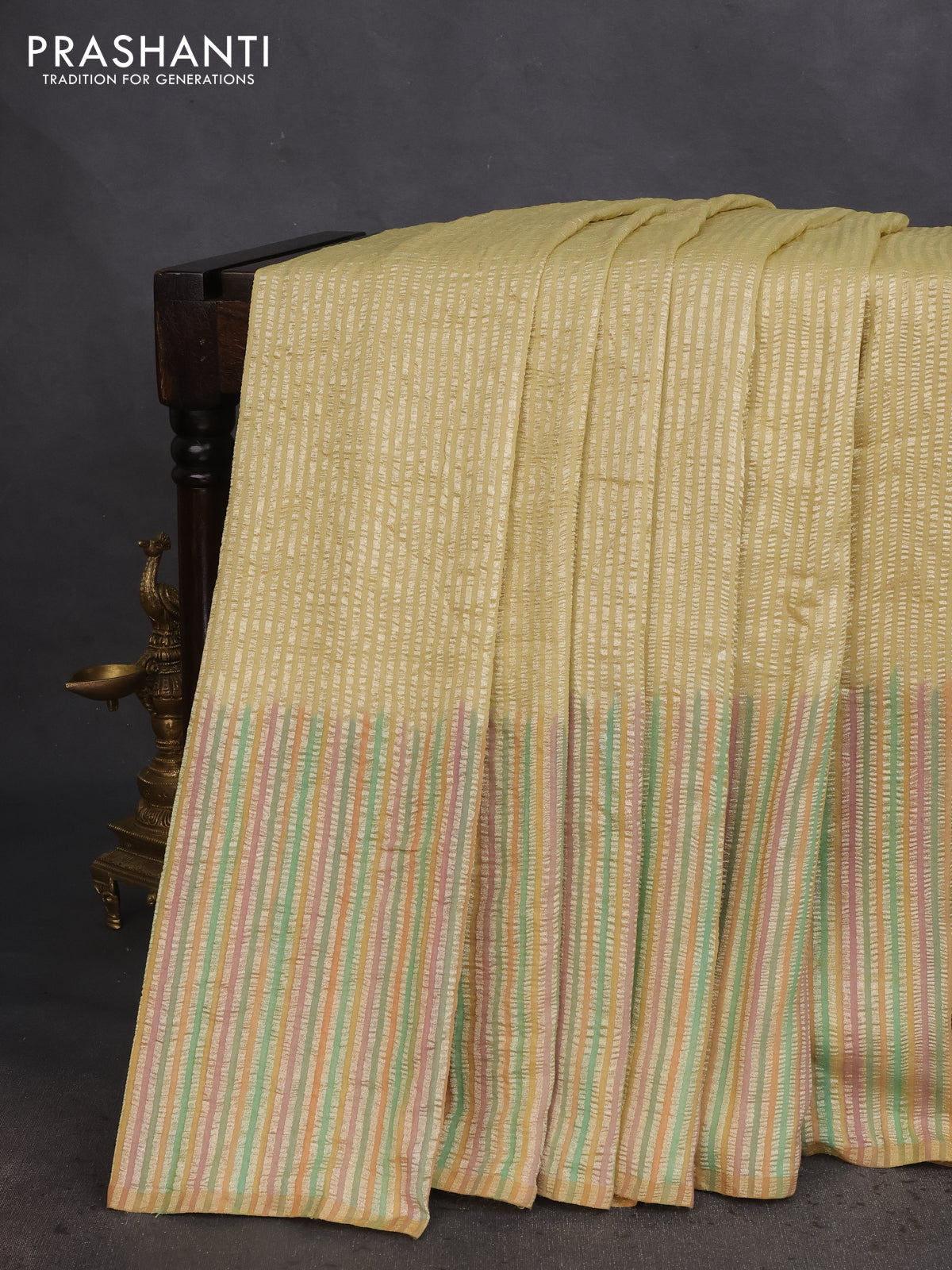 Munga silk saree pale yellow with allover zari woven stripes pattern in borderless style