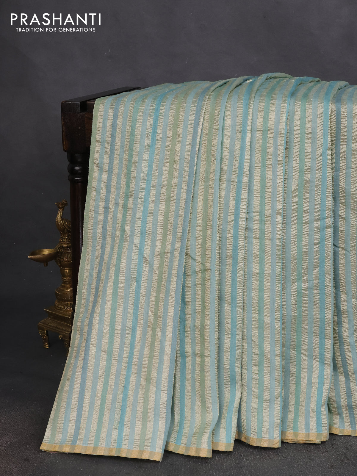Munga silk saree pastel blue with allover zari woven stripes pattern in borderless style